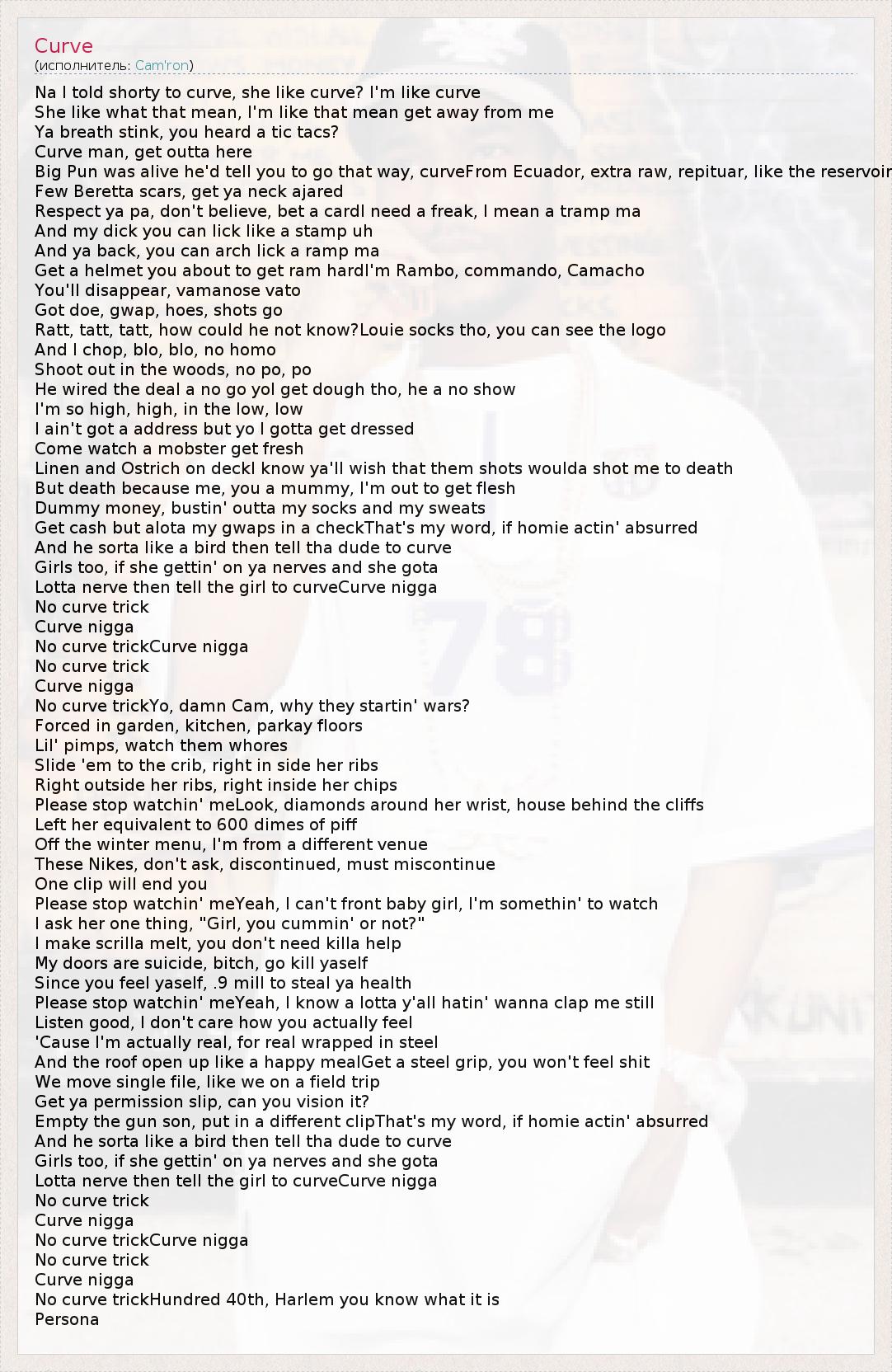 Na I told shorty to curve, she like curve? I'm like curve She like what that mean, I'm like that mean get away from me Ya breath stink, you heard a tic tacs? Curve man, get outta here Big Pun was alive he'd tell you to go that way, curveFrom Ecuador, extra raw, repituar, like the reservoir Few Beretta scars, get ya neck ajared Respect ya pa, don't believe, bet a cardI need a freak, I mean a tramp ma And my dick you can lick like a stamp uh And ya back, you can arch lick a ramp ma Get a helmet you about to get ram hardI'm Rambo, commando, Camacho You'll disappear, vamanose vato Got doe, gwap, hoes, shots go Ratt, tatt, tatt, how could he not know?Louie socks tho, you can see the logo And I chop, blo, blo, no homo Shoot out in the woods, no po, po He wired the deal a no go yoI get dough tho, he a no show I'm so high, high, in the low, low I ain't got a address but yo I gotta get dressed Come watch a mobster get fresh Linen and Ostrich on deckI know ya'll wish that them shots woulda shot me to death But death because me, you a mummy, I'm out to get flesh Dummy money, bustin' outta my socks and my sweats Get cash but alota my gwaps in a checkThat's my word, if homie actin' absurred And he sorta like a bird then tell tha dude to curve Girls too, if she gettin' on ya nerves and she gota Lotta nerve then tell the girl to curveCurve nigga No curve trick Curve nigga No curve trickCurve nigga No curve trick Curve nigga No curve trickYo, damn Cam, why they startin' wars? Forced in garden, kitchen, parkay floors Lil' pimps, watch them whores Slide 'em to the crib, right in side her ribs Right outside her ribs, right inside her chips Please stop watchin' meLook, diamonds around her wrist, house behind the cliffs Left her equivalent to 600 dimes of piff Off the winter menu, I'm from a different venue These Nikes, don't ask, discontinued, must miscontinue One clip will end you Please stop watchin' meYeah, I can't front baby girl, I'm somethin' to watch I ask her one thing, "Girl, you cummin' or not?" I make scrilla melt, you don't need killa help My doors are suicide, bitch, go kill yaself Since you feel yaself, .9 mill to steal ya health Please stop watchin' meYeah, I know a lotta y'all hatin' wanna clap me still Listen good, I don't care how you actually feel 'Cause I'm actually real, for real wrapped in steel And the roof open up like a happy mealGet a steel grip, you won't feel shit We move single file, like we on a field trip Get ya permission slip, can you vision it? Empty the gun son, put in a different clipThat's my word, if homie actin' absurred And he sorta like a bird then tell tha dude to curve Girls too, if she gettin' on ya nerves and she gota Lotta nerve then tell the girl to curveCurve nigga No curve trick Curve nigga No curve trickCurve nigga No curve trick Curve nigga No curve trickHundred 40th, Harlem you know what it is Persona