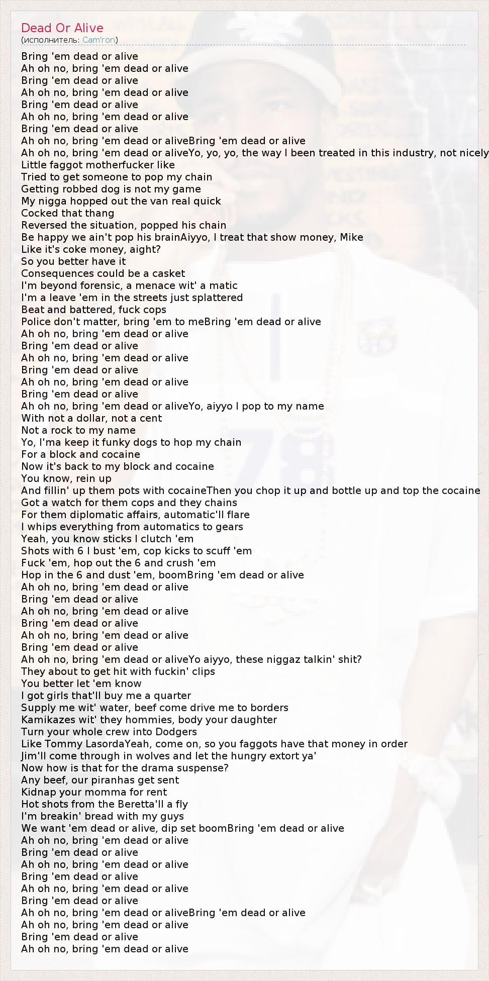 Ah oh no, bring 'em dead or aliveYo, yo, yo, the way I been treated in this industry, not nicely