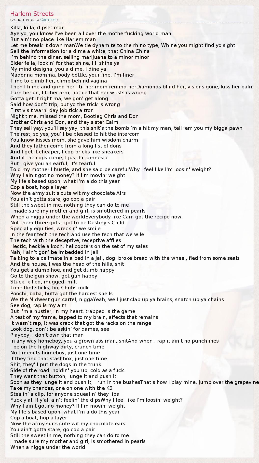 А как ты думаешь, о чем песня "Harlem Streets" ?