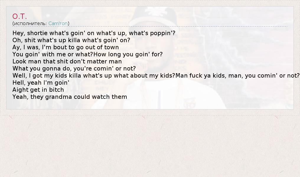 Hey, shortie what's goin' on what's up, what's poppin'? Oh, shit what's up killa what's goin' on? Ay, I was, I'm bout to go out of town You goin' with me or what?How long you goin' for? Look man that shit don't matter man What you gonna do, you're comin' or not? Well, I got my kids killa what's up what about my kids?Man fuck ya kids, man, you comin' or not? Hell, yeah I'm goin' Aight get in bitch Yeah, they grandma could watch them