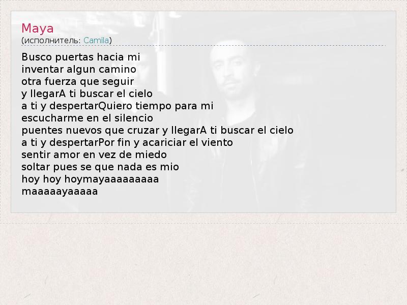 Это интересно:Camila is a Mexican soft rock group which reached staggering success in their home country and all over Latin America upon the release of their debut album Todo Cambió. It consists of vocalist, composer and producer Mario Domm, vocalist Samuel Parra and guitarist Pablo Hurtado, founded by Domm officially formed in 2005.According to the group, the name came from a friend's idea of calling the group "Camila" because it means "close to God". Their first single, "Abrázame" became a major airplay success upon its release. The song was played in the radio stations. In late 2006, the group was nominated for Best New Artist at the Premio Lo Nuestro 2007. The follow-up... продолжение