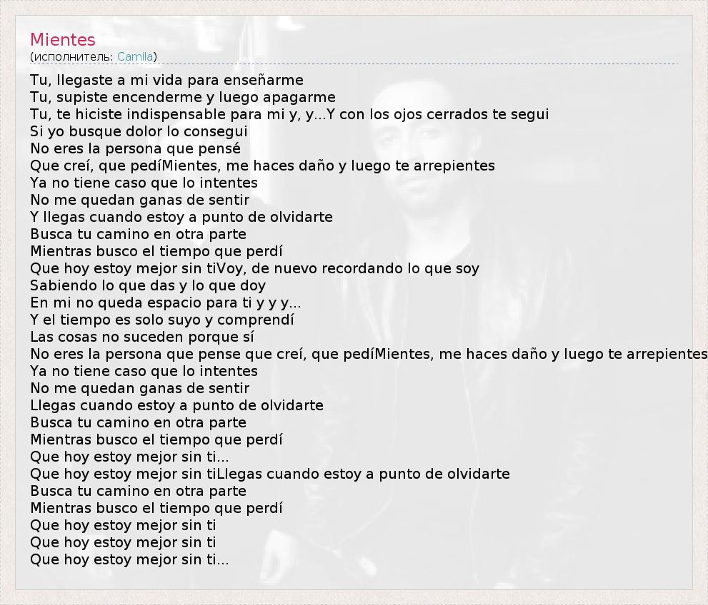 Это интересно:Camila is a Mexican soft rock group which reached staggering success in their home country and all over Latin America upon the release of their debut album Todo Cambió. It consists of vocalist, composer and producer Mario Domm, vocalist Samuel Parra and guitarist Pablo Hurtado, founded by Domm officially formed in 2005.According to the group, the name came from a friend's idea of calling the group "Camila" because it means "close to God". Their first single, "Abrázame" became a major airplay success upon its release. The song was played in the radio stations. In late 2006, the group was nominated for Best New Artist at the Premio Lo Nuestro 2007. The follow-up... продолжение