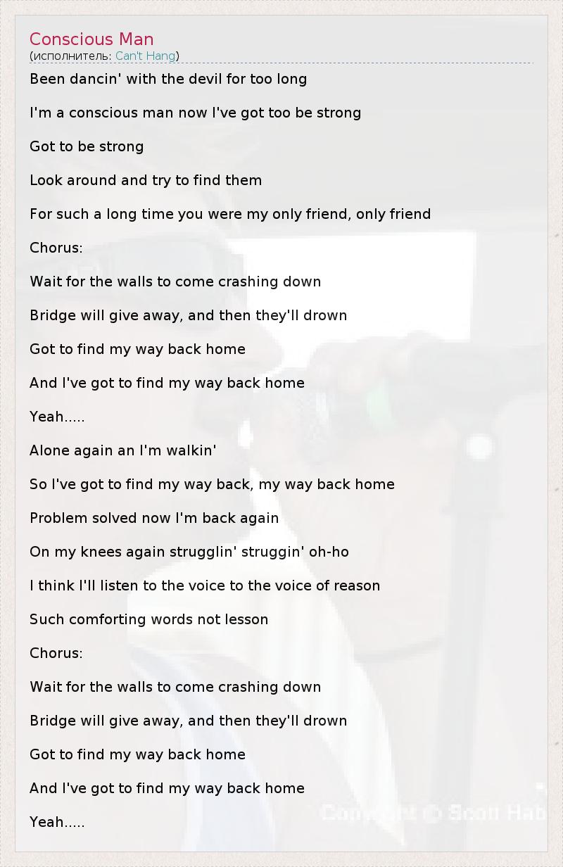 Been dancin' with the devil for too long I'm a conscious man now I've got too be strong Got to be strong Look around and try to find them For such a long time you were my only friend, only friend Chorus: Wait for the walls to come crashing down Bridge will give away, and then they'll drown Got to find my way back home And I've got to find my way back home Yeah..... Alone again an I'm walkin' So I've got to find my way back, my way back home Problem solved now I'm back again On my knees again strugglin' struggin' oh-ho I think I'll listen to the voice to the voice of reason Such comforting words not lesson Chorus: Wait for the walls to come crashing down Bridge will give away, and then they'll drown Got to find my way back home And I've got to find my way back home Yeah.....