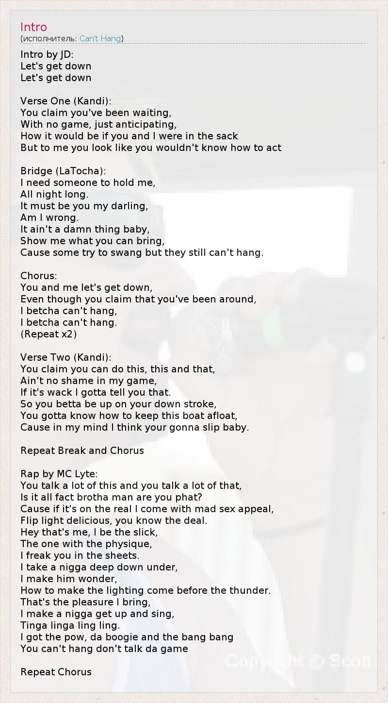 Intro by JD: Let's get down Let's get down Verse One (Kandi): You claim you've been waiting, With no game, just anticipating, How it would be if you and I were in the sack But to me you look like you wouldn't know how to act Bridge (LaTocha): I need someone to hold me, All night long. It must be you my darling, Am I wrong. It ain't a damn thing baby, Show me what you can bring, Cause some try to swang but they still can't hang. Chorus: You and me let's get down, Even though you claim that you've been around, I betcha can't hang, I betcha can't hang. (Repeat x2) Verse Two (Kandi): You claim you can do this, this and that, Ain't no shame in my game, If it's wack I gotta tell you that. So you betta be up on your down stroke, You gotta know how to keep this boat afloat, Cause in my mind I think your gonna slip baby. Repeat Break and Chorus Rap by MC Lyte: You talk a lot of this and you talk a lot of that, Is it all fact brotha man are you phat? Cause if it's on the real I come with mad sex appeal, Flip light delicious, you know the deal. Hey that's me, I be the slick, The one with the physique, I freak you in the sheets. I take a nigga deep down under, I make him wonder, How to make the lighting come before the thunder. That's the pleasure I bring, I make a nigga get up and sing, Tinga linga ling ling. I got the pow, da boogie and the bang bang You can't hang don't talk da game Repeat Chorus