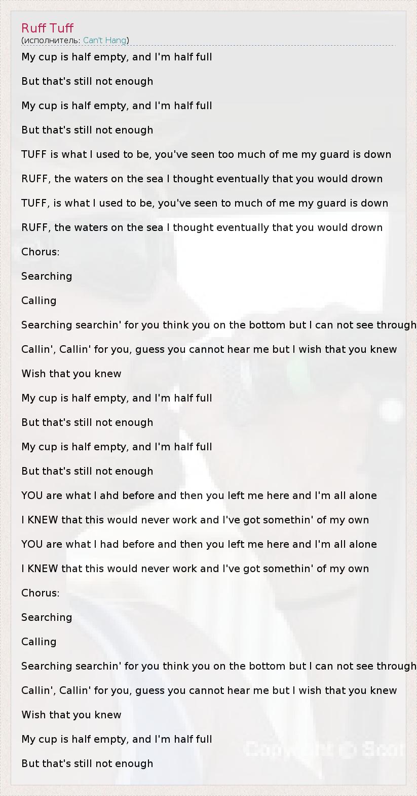 My cup is half empty, and I'm half full But that's still not enough My cup is half empty, and I'm half full But that's still not enough TUFF is what I used to be, you've seen too much of me my guard is down RUFF, the waters on the sea I thought eventually that you would drown TUFF, is what I used to be, you've seen to much of me my guard is down RUFF, the waters on the sea I thought eventually that you would drown Chorus: Searching Calling Searching searchin' for you think you on the bottom but I can not see through Callin', Callin' for you, guess you cannot hear me but I wish that you knew Wish that you knew My cup is half empty, and I'm half full But that's still not enough My cup is half empty, and I'm half full But that's still not enough YOU are what I ahd before and then you left me here and I'm all alone I KNEW that this would never work and I've got somethin' of my own YOU are what I had before and then you left me here and I'm all alone I KNEW that this would never work and I've got somethin' of my own Chorus: Searching Calling Searching searchin' for you think you on the bottom but I can not see through Callin', Callin' for you, guess you cannot hear me but I wish that you knew Wish that you knew My cup is half empty, and I'm half full But that's still not enough