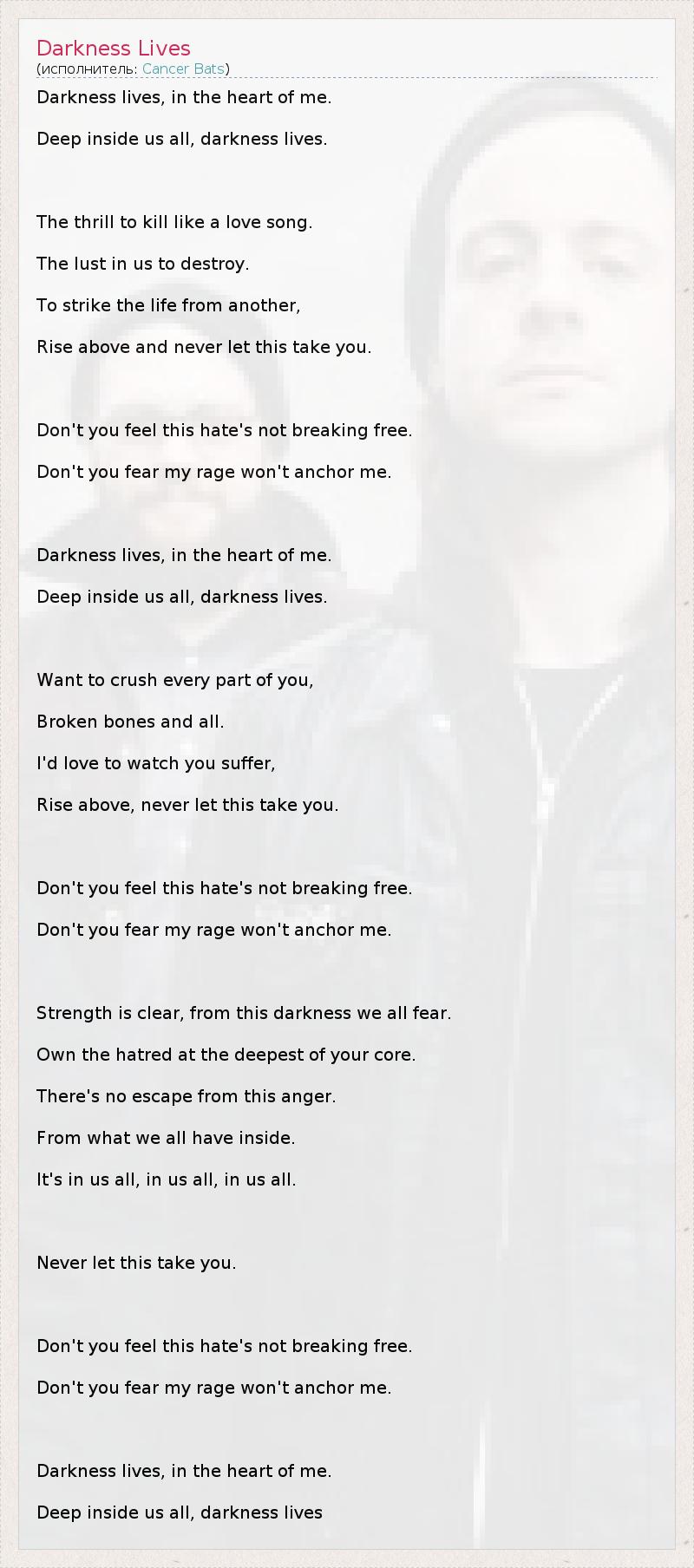 Darkness lives, in the heart of me. Deep inside us all, darkness lives. The thrill to kill like a love song. The lust in us to destroy. To strike the life from another, Rise above and never let this take you. Don't you feel this hate's not breaking free. Don't you fear my rage won't anchor me. Darkness lives, in the heart of me. Deep inside us all, darkness lives. Want to crush every part of you, Broken bones and all. I'd love to watch you suffer, Rise above, never let this take you. Don't you feel this hate's not breaking free. Don't you fear my rage won't anchor me. Strength is clear, from this darkness we all fear. Own the hatred at the deepest of your core. There's no escape from this anger. From what we all have inside. It's in us all, in us all, in us all. Never let this take you. Don't you feel this hate's not breaking free. Don't you fear my rage won't anchor me. Darkness lives, in the heart of me. Deep inside us all, darkness lives