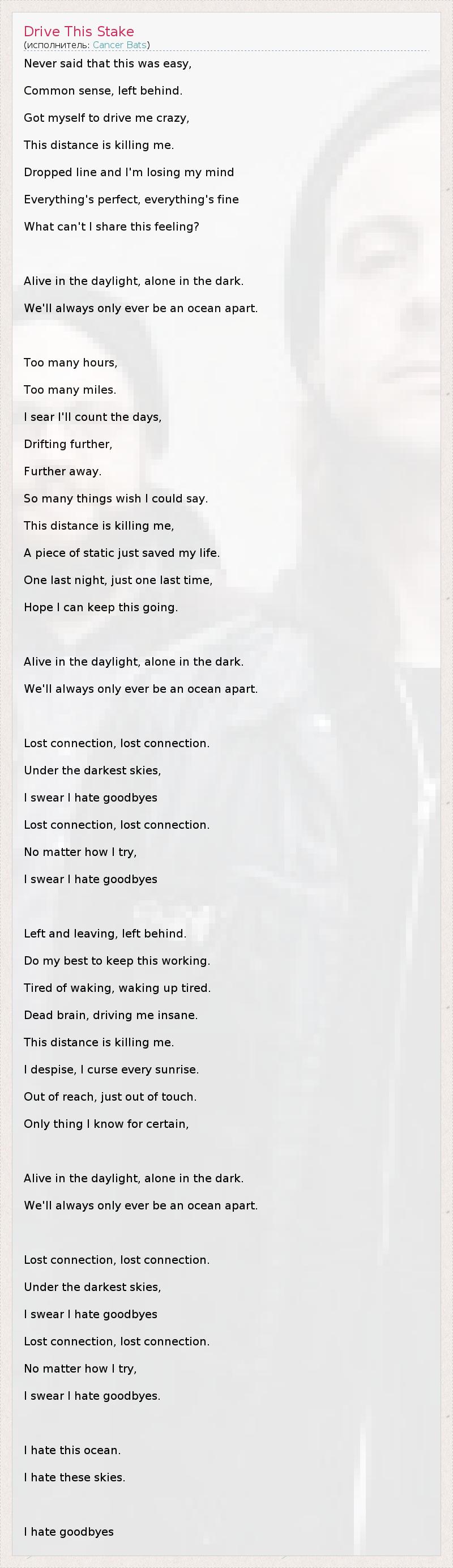 Never said that this was easy, Common sense, left behind. Got myself to drive me crazy, This distance is killing me. Dropped line and I'm losing my mind Everything's perfect, everything's fine What can't I share this feeling? Alive in the daylight, alone in the dark. We'll always only ever be an ocean apart. Too many hours, Too many miles. I sear I'll count the days, Drifting further, Further away. So many things wish I could say. This distance is killing me, A piece of static just saved my life. One last night, just one last time, Hope I can keep this going. Alive in the daylight, alone in the dark. We'll always only ever be an ocean apart. Lost connection, lost connection. Under the darkest skies, I swear I hate goodbyes Lost connection, lost connection. No matter how I try, I swear I hate goodbyes Left and leaving, left behind. Do my best to keep this working. Tired of waking, waking up tired. Dead brain, driving me insane. This distance is killing me. I despise, I curse every sunrise. Out of reach, just out of touch. Only thing I know for certain, Alive in the daylight, alone in the dark. We'll always only ever be an ocean apart. Lost connection, lost connection. Under the darkest skies, I swear I hate goodbyes Lost connection, lost connection. No matter how I try, I swear I hate goodbyes. I hate this ocean. I hate these skies. I hate goodbyes