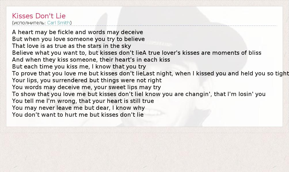 A heart may be fickle and words may deceive But when you love someone you try to believe That love is as true as the stars in the sky Believe what you want to, but kisses don't lieA true lover's kisses are moments of bliss And when they kiss someone, their heart's in each kiss But each time you kiss me, I know that you try To prove that you love me but kisses don't lieLast night, when I kissed you and held you so tight Your lips, you surrendered but things were not right You words may deceive me, your sweet lips may try To show that you love me but kisses don't lieI know you are changin', that I'm losin' you You tell me I'm wrong, that your heart is still true You may never leave me but dear, I know why You don't want to hurt me but kisses don't lie