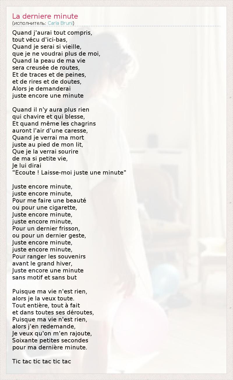 Quand j'aurai tout compris, tout vécu d'ici-bas, Quand je serai si vieille, que je ne voudrai plus de moi, Quand la peau de ma vie sera creusée de routes, Et de traces et de peines, et de rires et de doutes, Alors je demanderai juste encore une minute Quand il n'y aura plus rien qui chavire et qui blesse, Et quand même les chagrins auront l'air d'une caresse, Quand je verrai ma mort juste au pied de mon lit, Que je la verrai sourire de ma si petite vie, Je lui dirai "Еcoute ! Laisse-moi juste une minute" Juste encore minute, juste encore minute, Pour me faire une beauté ou pour une cigarette, Juste encore minute, juste encore minute, Pour un dernier frisson, ou pour un dernier geste, Juste encore minute, juste encore minute, Pour ranger les souvenirs avant le grand hiver, Juste encore une minute sans motif et sans but Puisque ma vie n'est rien, alors je la veux toute. Tout entière, tout à fait et dans toutes ses déroutes, Puisque ma vie n'est rien, alors j'en redemande, Je veux qu'on m'en rajoute, Soixante petites secondes pour ma dernière minute. Tic tac tic tac tic tac