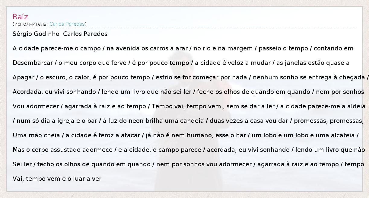 Это интересно:Карлуш Паредеш (Carlos Paredes) – гений португальской гитары и композитор. Португальская гитара от классической отличается формой и сдвоенными струнами. У неё очень необычное и мелодичное звучание.Родился Карлуш 16 февраля 1925 года в семье не менее известного в Португалии Артура Паредеша (именно отец вывел португальское фадо на международный уровень в 20-м веке).В возрасте четырёх лет... продолжение