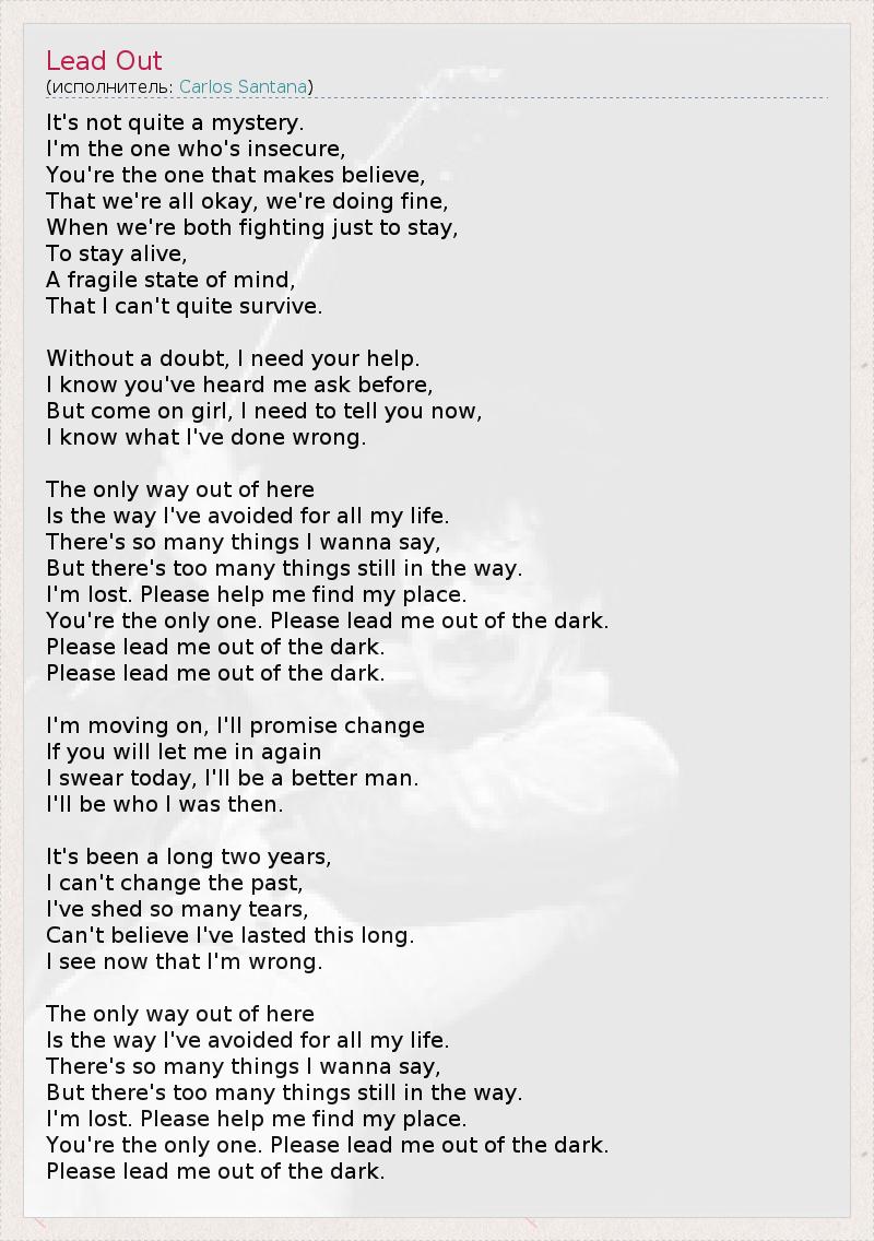 Это вовсе не тайна: Меня одолевают сомнения, А ты заставляешь меня поверить, Что мы в полном порядке, что все хорошо, Несмотря на то, что мы пытаемся просто остаться, Остаться в живых. Ранить душу так легко, И я едва ли могу это пережить. Несомненно, мне нужна твоя помощь. Я знаю, что я уже просил тебя, Но послушай, мне надо сказать тебе сейчас: Я знаю, что я сделал не так. Есть только один выход, Но именно его я избегал всю свою жизнь. Так много всего я хочу сказать тебе, Но слова не могут исправить всего, что случилось. 1 Я потерян. Пожалуйста, помоги мне найти свое место в жизни. Только ты одна. Пожалуйста, выведи меня из темноты . Пожалуйста, выведи меня из темноты. Пожалуйста, выведи меня из темноты. Я не стою на месте, я обещаю измениться. Если позволишь мне снова войти в твою жизнь, Я клянусь, что стану лучше. Я стану тем, кем был раньше Это были долгие два года. Я не могу изменить прошлое. Я пролил так много слез. Не могу поверить, что я продержался так долго. Теперь я вижу, что я не прав. Есть только один выход. Но именно его я избегал всю свою жизнь. Так много всего я хочу сказать тебе, Но слова не могут исправить все, что случилось. Я потерян. Пожалуйста, помоги мне найти свое место в жизни. Только ты одна. Пожалуйста, выведи меня из темноты. Пожалуйста, выведи меня из темноты. 1 - дословно: Но ещё слишком многое у нас на пути