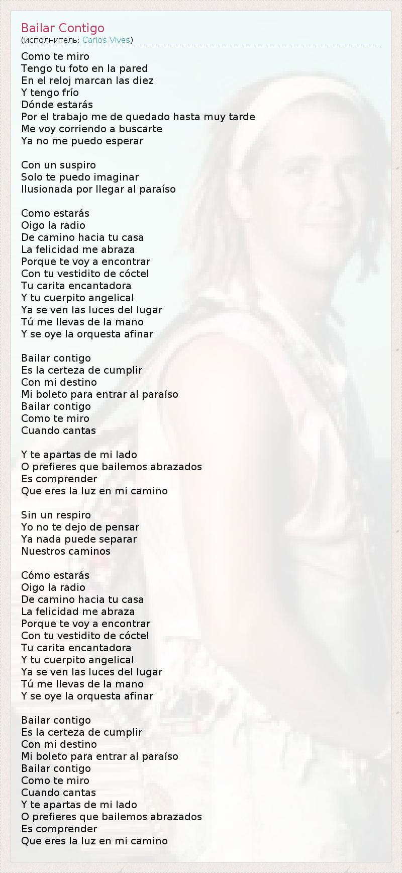 Como te miro Tengo tu foto en la pared En el reloj marcan las diez Y tengo frío Dónde estarás Por el trabajo me de quedado hasta muy tarde Me voy corriendo a buscarte Ya no me puedo esperar Con un suspiro Solo te puedo imaginar Ilusionada por llegar al paraíso Como estarás Oigo la radio De camino hacia tu casa La felicidad me abraza Porque te voy a encontrar Con tu vestidito de cóctel Tu carita encantadora Y tu cuerpito angelical Ya se ven las luces del lugar Tú me llevas de la mano Y se oye la orquesta afinar Bailar contigo Es la certeza de cumplir Con mi destino Mi boleto para entrar al paraíso Bailar contigo Como te miro Cuando cantas Y te apartas de mi lado O prefieres que bailemos abrazados Es comprender Que eres la luz en mi camino Sin un respiro Yo no te dejo de pensar Ya nada puede separar Nuestros caminos Cómo estarás Oigo la radio De camino hacia tu casa La felicidad me abraza Porque te voy a encontrar Con tu vestidito de cóctel Tu carita encantadora Y tu cuerpito angelical Ya se ven las luces del lugar Tú me llevas de la mano Y se oye la orquesta afinar Bailar contigo Es la certeza de cumplir Con mi destino Mi boleto para entrar al paraíso Bailar contigo Como te miro Cuando cantas Y te apartas de mi lado O prefieres que bailemos abrazados Es comprender Que eres la luz en mi camino
