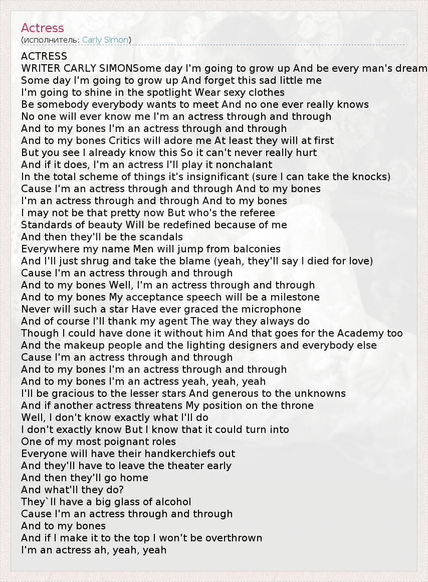 ACTRESS WRITER CARLY SIMONSome day I'm going to grow up And be every man's dream Some day I'm going to grow up And forget this sad little me I'm going to shine in the spotlight Wear sexy clothes Be somebody everybody wants to meet And no one ever really knows No one will ever know me I'm an actress through and through And to my bones I'm an actress through and through And to my bones Critics will adore me At least they will at first But you see I already know this So it can't never really hurt And if it does, I'm an actress I'll play it nonchalant In the total scheme of things it's insignificant (sure I can take the knocks) Cause I'm an actress through and through And to my bones I'm an actress through and through And to my bones I may not be that pretty now But who's the referee Standards of beauty Will be redefined because of me And then they'll be the scandals Everywhere my name Men will jump from balconies And I'll just shrug and take the blame (yeah, they'll say I died for love) Cause I'm an actress through and through And to my bones Well, I'm an actress through and through And to my bones My acceptance speech will be a milestone Never will such a star Have ever graced the microphone And of course I'll thank my agent The way they always do Though I could have done it without him And that goes for the Academy too And the makeup people and the lighting designers and everybody else Cause I'm an actress through and through And to my bones I'm an actress through and through And to my bones I'm an actress yeah, yeah, yeah I'll be gracious to the lesser stars And generous to the unknowns And if another actress threatens My position on the throne Well, I don't know exactly what I'll do I don't exactly know But I know that it could turn into One of my most poignant roles Everyone will have their handkerchiefs out And they'll have to leave the theater early And then they'll go home And what'll they do? They`ll have a big glass of alcohol Cause I'm an actress through and through And to my bones And if I make it to the top I won't be overthrown I'm an actress ah, yeah, yeah