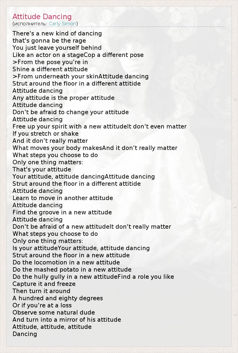 There's a new kind of dancing that's gonna be the rage You just leave yourself behind Like an actor on a stageCop a different pose >From the pose you're in Shine a different attitude >From underneath your skinAttitude dancing Strut around the floor in a different attitide Attitude dancing Any attitude is the proper attitude Attitude dancing Don't be afraid to change your attitude Attitude dancing Free up your spirit with a new attitudeIt don't even matter If you stretch or shake And it don't really matter What moves your body makesAnd it don't really matter What steps you choose to do Only one thing matters: That's your attitude Your attitude, attitude dancingAttitude dancing Strut around the floor in a different attitide Attitude dancing Learn to move in another attitude Attitude dancing Find the groove in a new attitude Attitude dancing Don't be afraid of a new attitudeIt don't really matter What steps you choose to do Only one thing matters: Is your attitudeYour attitude, attitude dancing Strut around the floor in a new attitude Do the locomotion in a new attitude Do the mashed potato in a new attitude Do the hully gully in a new attitudeFind a role you like Capture it and freeze Then turn it around A hundred and eighty degrees Or if you're at a loss Observe some natural dude And turn into a mirror of his attitude Attitude, attitude, attitude Dancing