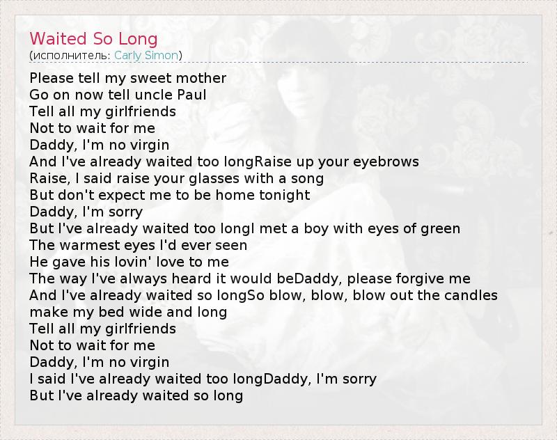 Please tell my sweet mother Go on now tell uncle Paul Tell all my girlfriends Not to wait for me Daddy, I'm no virgin And I've already waited too longRaise up your eyebrows Raise, I said raise your glasses with a song But don't expect me to be home tonight Daddy, I'm sorry But I've already waited too longI met a boy with eyes of green The warmest eyes I'd ever seen He gave his lovin' love to me The way I've always heard it would beDaddy, please forgive me And I've already waited so longSo blow, blow, blow out the candles make my bed wide and long Tell all my girlfriends Not to wait for me Daddy, I'm no virgin I said I've already waited too longDaddy, I'm sorry But I've already waited so long