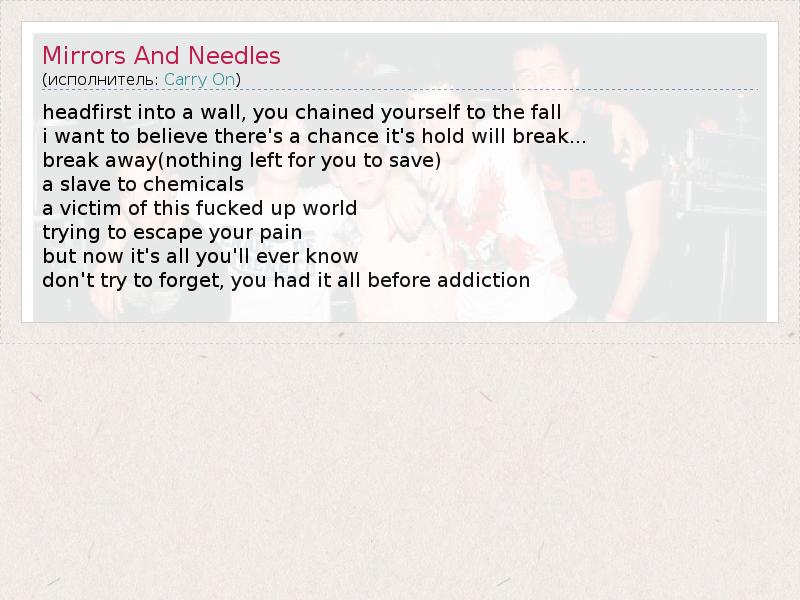 headfirst into a wall, you chained yourself to the fall i want to believe there's a chance it's hold will break... break away(nothing left for you to save) a slave to chemicals a victim of this fucked up world trying to escape your pain but now it's all you'll ever know don't try to forget, you had it all before addiction