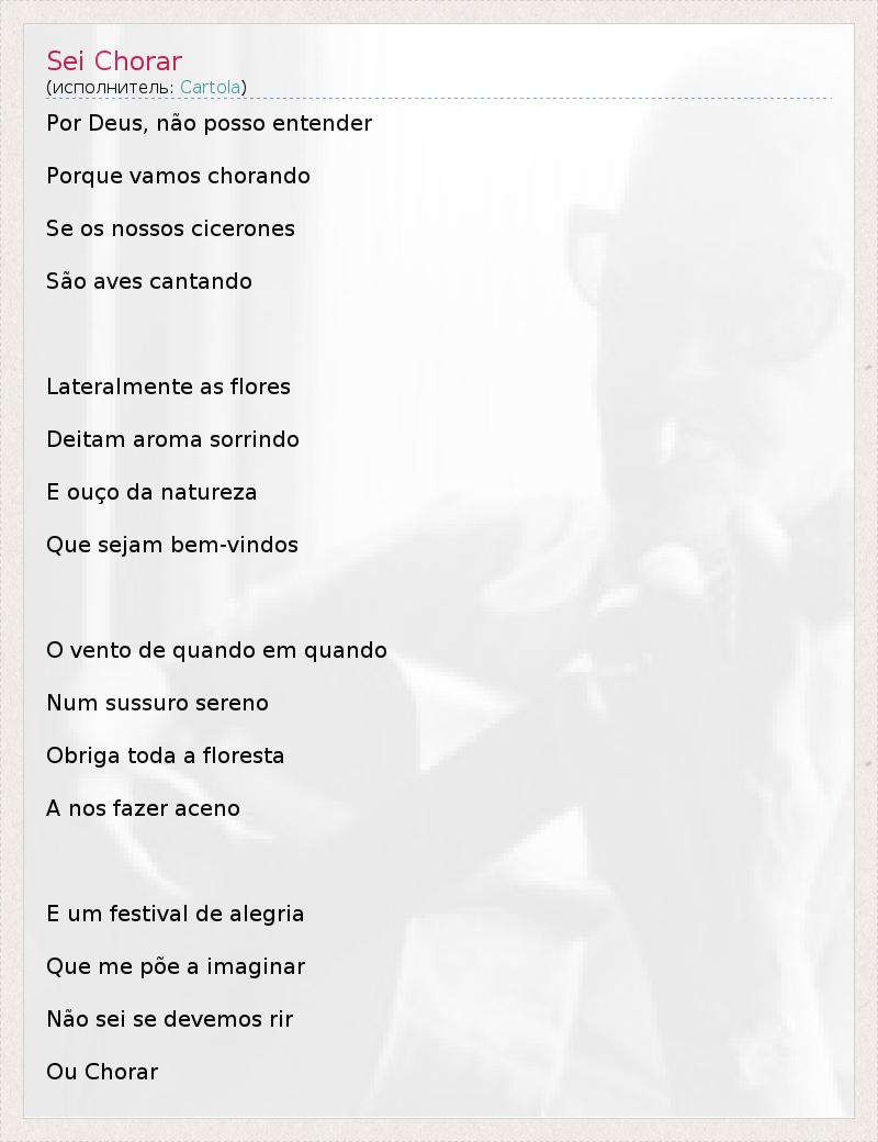 Это интересно:Есть две самбы. Одна - самба Картолы (Cartola) (1908-1980), и другая - все остальные. Это высокомерное утверждение, но я думаю, что это так и есть. Слушая много бразильской музыки, я продолжаю открывать супергигантов; Бразилия полна больших музыкантов. Но я все еще чувствую, что Картола является каким-то особенным. Для меня, Картола представляет самую красивую сущность бразильской музыки. Музыка... продолжение