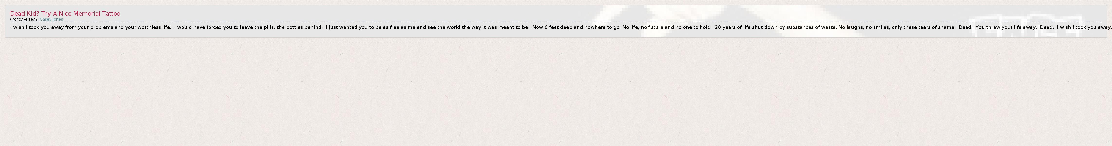 А как ты думаешь, о чем песня "Dead Kid? Try A Nice Memorial Tattoo" ?