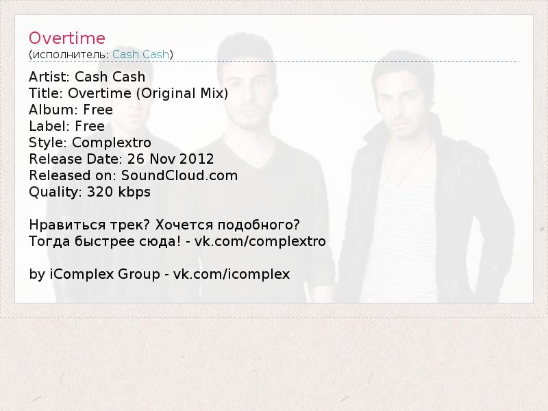 Artist: Cash Cash Title: Overtime (Original Mix) Album: Free Label: Free Style: Complextro Release Date: 26 Nov 2012 Released on: SoundCloud.com Quality: 320 kbps Нравиться трек? Хочется подобного? Тогда быстрее сюда! - vk.com/complextro by iComplex Group - vk.com/icomplex