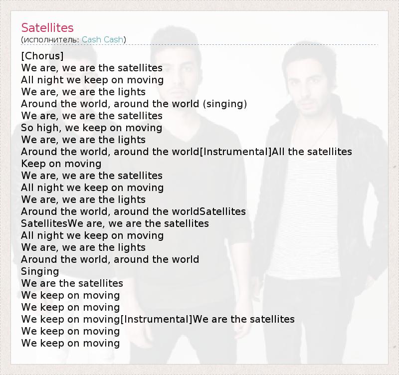 [Chorus] We are, we are the satellites All night we keep on moving We are, we are the lights Around the world, around the world (singing) We are, we are the satellites So high, we keep on moving We are, we are the lights Around the world, around the world[Instrumental]All the satellites Keep on moving We are, we are the satellites All night we keep on moving We are, we are the lights Around the world, around the worldSatellites SatellitesWe are, we are the satellites All night we keep on moving We are, we are the lights Around the world, around the world Singing We are the satellites We keep on moving We keep on moving We keep on moving[Instrumental]We are the satellites We keep on moving We keep on moving