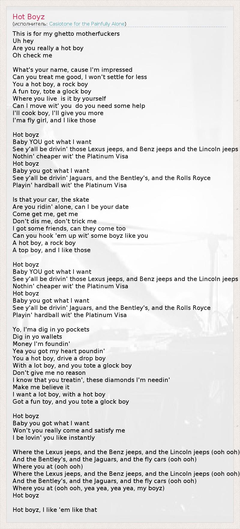 This is for my ghetto motherfuckers Uh hey Are you really a hot boy Oh check me What's your name, cause I'm impressed Can you treat me good, I won't settle for less You a hot boy, a rock boy A fun toy, tote a glock boy Where you live is it by yourself Can I move wit' you do you need some help I'll cook boy, I'll give you more I'ma fly girl, and I like those Hot boyz Baby YOU got what I want See y'all be drivin' those Lexus jeeps, and Benz jeeps and the Lincoln jeeps Nothin' cheaper wit' the Platinum Visa Hot boyz Baby you got what I want See y'all be drivin' Jaguars, and the Bentley's, and the Rolls Royce Playin' hardball wit' the Platinum Visa Is that your car, the skate Are you ridin' alone, can I be your date Come get me, get me Don't dis me, don't trick me I got some friends, can they come too Can you hook 'em up wit' some boyz like you A hot boy, a rock boy A top boy, and I like those Hot boyz Baby YOU got what I want See y'all be drivin' those Lexus jeeps, and Benz jeeps and the Lincoln jeeps Nothin' cheaper wit' the Platinum Visa Hot boyz Baby you got what I want See y'all be drivin' Jaguars, and the Bentley's, and the Rolls Royce Playin' hardball wit' the Platinum Visa Yo, I'ma dig in yo pockets Dig in yo wallets Money I'm foundin' Yea you got my heart poundin' You a hot boy, drive a drop boy With a lot boy, and you tote a glock boy Don't give me no reason I know that you treatin', these diamonds I'm needin' Make me believe it I want a lot boy, with a hot boy Got a fun toy, and you tote a glock boy Hot boyz Baby you got what I want Won't you really come and satisfy me I be lovin' you like instantly Where the Lexus jeeps, and the Benz jeeps, and the Lincoln jeeps (ooh ooh) And the Bentley's, and the Jaguars, and the fly cars (ooh ooh) Where you at (ooh ooh) Where the Lexus jeeps, and the Benz jeeps, and the Lincoln jeeps (ooh ooh) And the Bentley's, and the Jaguars, and the fly cars (ooh ooh) Where you at (ooh ooh, yea yea, yea yea, my boyz) Hot boyz Hot boyz, I like 'em like that