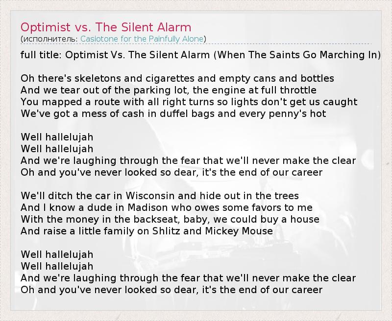 full title: Optimist Vs. The Silent Alarm (When The Saints Go Marching In) Oh there's skeletons and cigarettes and empty cans and bottles And we tear out of the parking lot, the engine at full throttle You mapped a route with all right turns so lights don't get us caught We've got a mess of cash in duffel bags and every penny's hot Well hallelujah Well hallelujah And we're laughing through the fear that we'll never make the clear Oh and you've never looked so dear, it's the end of our career We'll ditch the car in Wisconsin and hide out in the trees And I know a dude in Madison who owes some favors to me With the money in the backseat, baby, we could buy a house And raise a little family on Shlitz and Mickey Mouse Well hallelujah Well hallelujah And we're laughing through the fear that we'll never make the clear Oh and you've never looked so dear, it's the end of our career