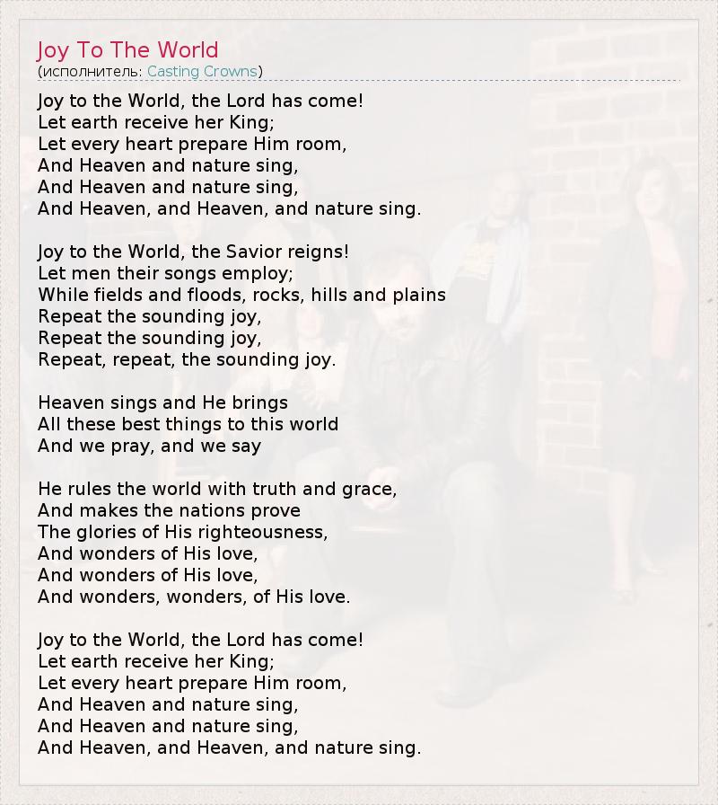 Joy to the World, the Lord has come! Let earth receive her King; Let every heart prepare Him room, And Heaven and nature sing, And Heaven and nature sing, And Heaven, and Heaven, and nature sing. Joy to the World, the Savior reigns! Let men their songs employ; While fields and floods, rocks, hills and plains Repeat the sounding joy, Repeat the sounding joy, Repeat, repeat, the sounding joy. Heaven sings and He brings All these best things to this world And we pray, and we say He rules the world with truth and grace, And makes the nations prove The glories of His righteousness, And wonders of His love, And wonders of His love, And wonders, wonders, of His love. Joy to the World, the Lord has come! Let earth receive her King; Let every heart prepare Him room, And Heaven and nature sing, And Heaven and nature sing, And Heaven, and Heaven, and nature sing.
