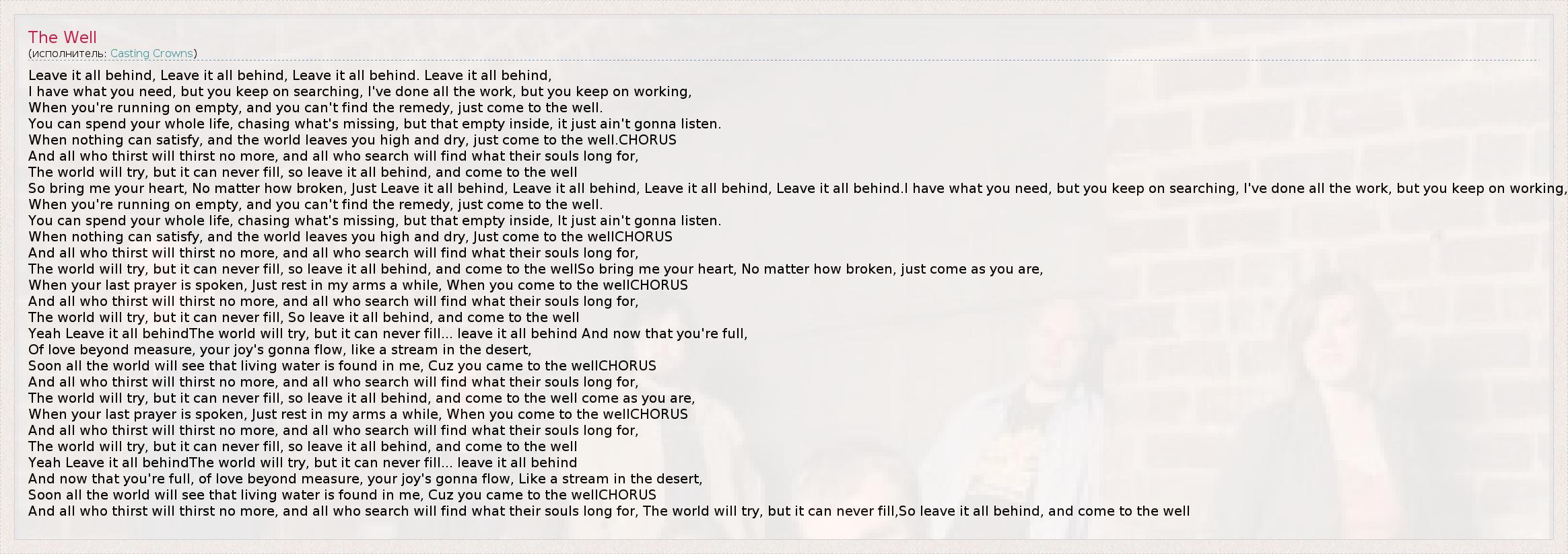 When nothing can satisfy, and the world leaves you high and dry, just come to the well.CHORUS