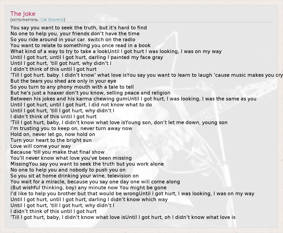 You say you want to seek the truth, but it's hard to find No one to help you, your friends don't have the time So you ride around in your car. switch on the radio You want to relate to something you once read in a book What kind of a way to try to take a lookUntil I got hurt I was looking, I was on my way Until I got hurt, until I got hurt, darling I painted my face gray Until I got hurt, 'till got hurt, why didn't I I didn't think of this until I got hurt 'Till I got hurt. baby. I didn't know' what love isYou say you want to learn to laugh 'cause music makes you cry But the tears you shed are only in your eye So you turn to any phony mouth with a tale to tell But he's just a hoaxer don't you know, selling peace and religion Between his jokes and his karma chewing gumUntil I got hurt, I was looking, I was the same as you Until I got hurt, until I got hurt, I did not know what to do Until I got hurt, 'till I got hurt, why didn't I I didn't think of this until I got hurt 'Till I got hurt, baby, I didn't know what love isYoung son, don't let me down, young son I'm trusting you to keep on, never turn away now Hold on, never let go, now hold on Turn your heart to the bright sun Love will come your way Because 'till you make that final show You'll never know what love you've been missing MissingYou say you want to seek the truth but you work alone No one to help you and nobody to push you on So you sit at home drinking your wine, television on You wait for a miracle, because you say one day one will come along (But wishful thinking, boy) any minute now You might be gone I'd like to help you brother but that would be wrongUntil I got hurt, I was looking, I was on my way Until I got hurt, until I got hurt, darling I didn't know which way Until I got hurt, 'till I got hurt, why didn't I I didn't think of this until I got hurt 'Till I got hurt, baby, I didn't know what love isUntil I got hurt, oh I didn't know what love is