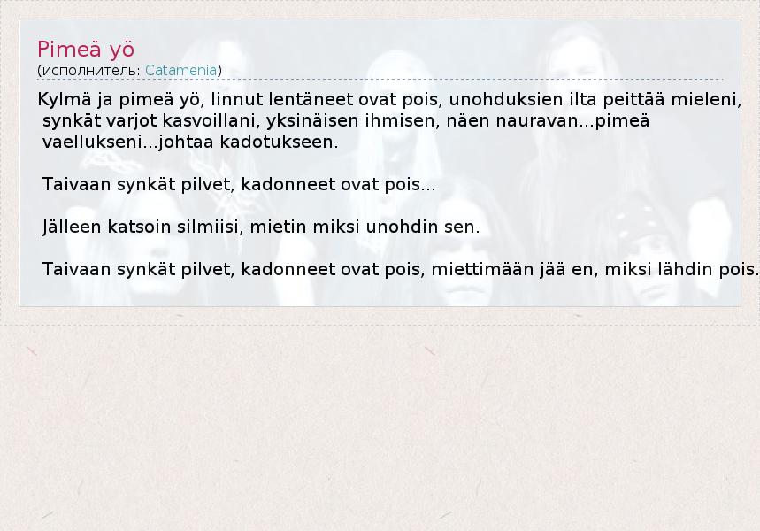 А как ты думаешь, о чем песня "Pimeä yö" ?