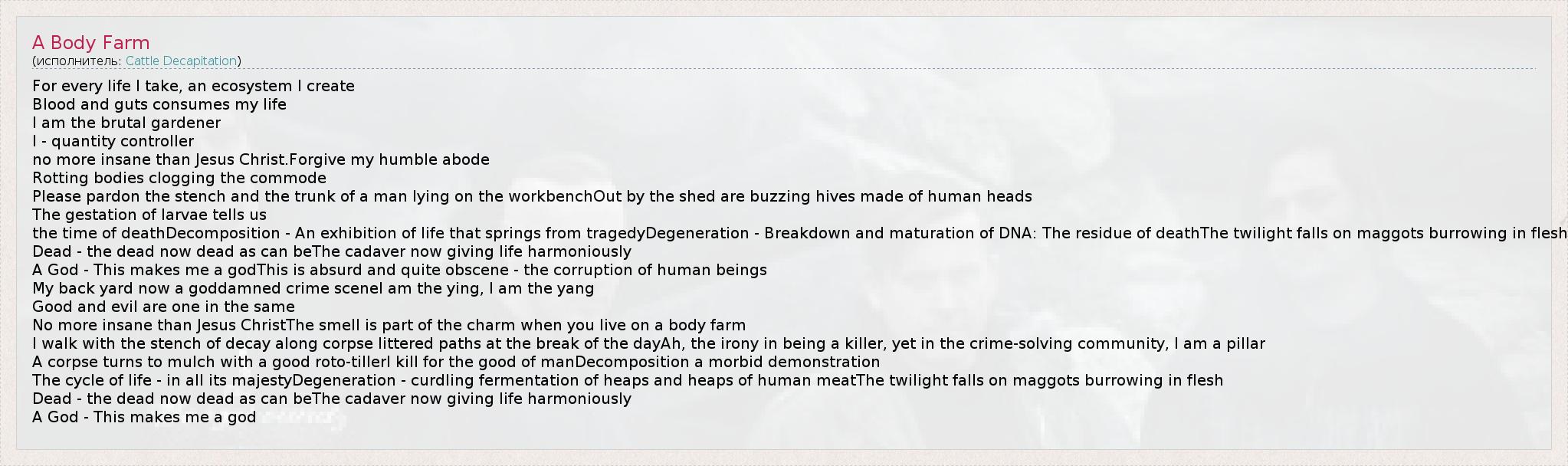 For every life I take, an ecosystem I create Blood and guts consumes my life I am the brutal gardener I - quantity controller no more insane than Jesus Christ.Forgive my humble abode Rotting bodies clogging the commode Please pardon the stench and the trunk of a man lying on the workbenchOut by the shed are buzzing hives made of human heads The gestation of larvae tells us the time of deathDecomposition - An exhibition of life that springs from tragedyDegeneration - Breakdown and maturation of DNA: The residue of deathThe twilight falls on maggots burrowing in flesh Dead - the dead now dead as can beThe cadaver now giving life harmoniously A God - This makes me a godThis is absurd and quite obscene - the corruption of human beings My back yard now a goddamned crime sceneI am the ying, I am the yang Good and evil are one in the same No more insane than Jesus ChristThe smell is part of the charm when you live on a body farm I walk with the stench of decay along corpse littered paths at the break of the dayAh, the irony in being a killer, yet in the crime-solving community, I am a pillar A corpse turns to mulch with a good roto-tillerI kill for the good of manDecomposition a morbid demonstration The cycle of life - in all its majestyDegeneration - curdling fermentation of heaps and heaps of human meatThe twilight falls on maggots burrowing in flesh Dead - the dead now dead as can beThe cadaver now giving life harmoniously A God - This makes me a god