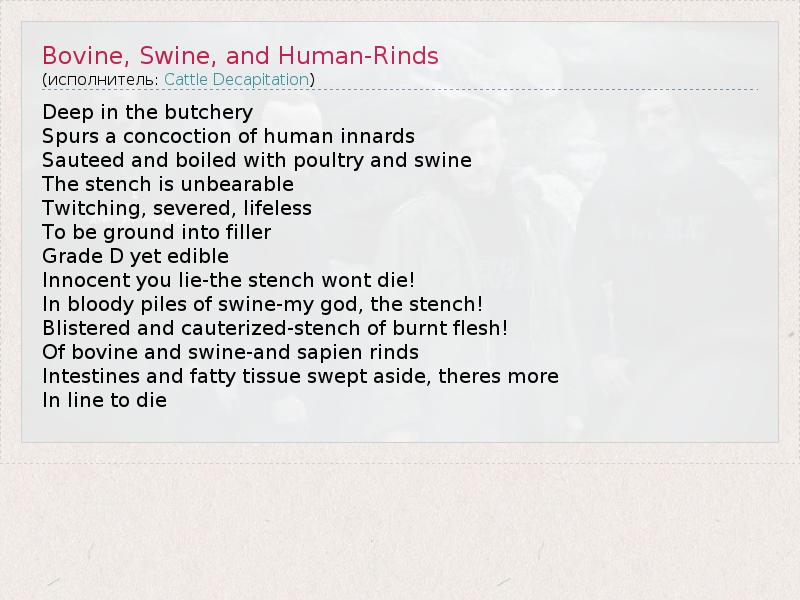 А как ты думаешь, о чем песня "Bovine, Swine, and Human-Rinds" ?