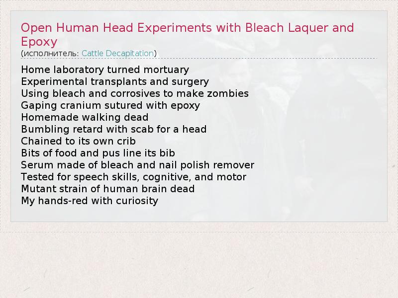 А как ты думаешь, о чем песня "Open Human Head Experiments with Bleach Laquer and Epoxy" ?