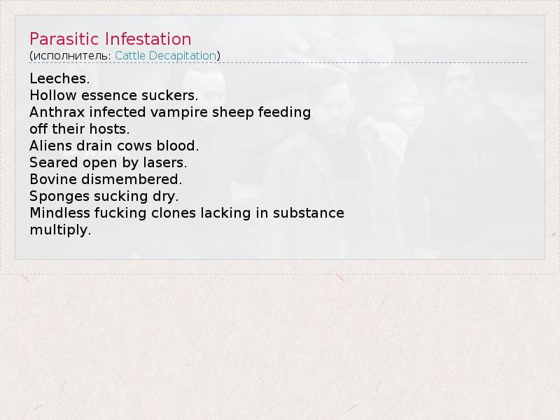 А как ты думаешь, о чем песня "Parasitic Infestation" ?
