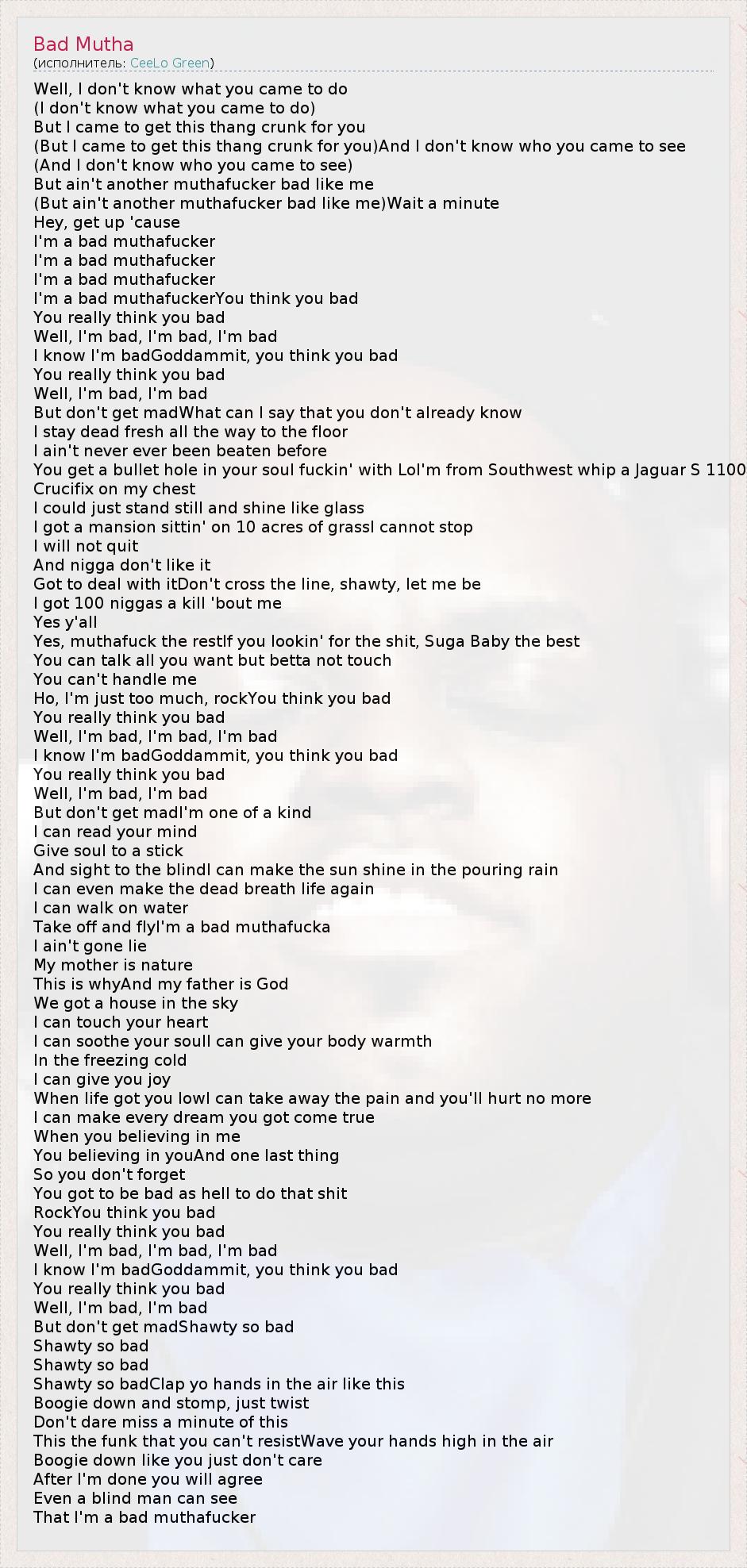 Well, I don't know what you came to do (I don't know what you came to do) But I came to get this thang crunk for you (But I came to get this thang crunk for you)And I don't know who you came to see (And I don't know who you came to see) But ain't another muthafucker bad like me (But ain't another muthafucker bad like me)Wait a minute Hey, get up 'cause I'm a bad muthafucker I'm a bad muthafucker I'm a bad muthafucker I'm a bad muthafuckerYou think you bad You really think you bad Well, I'm bad, I'm bad, I'm bad I know I'm badGoddammit, you think you bad You really think you bad Well, I'm bad, I'm bad But don't get madWhat can I say that you don't already know I stay dead fresh all the way to the floor I ain't never ever been beaten before You get a bullet hole in your soul fuckin' with LoI'm from Southwest whip a Jaguar S 1100 Crucifix on my chest I could just stand still and shine like glass I got a mansion sittin' on 10 acres of grassI cannot stop I will not quit And nigga don't like it Got to deal with itDon't cross the line, shawty, let me be I got 100 niggas a kill 'bout me Yes y'all Yes, muthafuck the restIf you lookin' for the shit, Suga Baby the best You can talk all you want but betta not touch You can't handle me Ho, I'm just too much, rockYou think you bad You really think you bad Well, I'm bad, I'm bad, I'm bad I know I'm badGoddammit, you think you bad You really think you bad Well, I'm bad, I'm bad But don't get madI'm one of a kind I can read your mind Give soul to a stick And sight to the blindI can make the sun shine in the pouring rain I can even make the dead breath life again I can walk on water Take off and flyI'm a bad muthafucka I ain't gone lie My mother is nature This is whyAnd my father is God We got a house in the sky I can touch your heart I can soothe your soulI can give your body warmth In the freezing cold I can give you joy When life got you lowI can take away the pain and you'll hurt no more I can make every dream you got come true When you believing in me You believing in youAnd one last thing So you don't forget You got to be bad as hell to do that shit RockYou think you bad You really think you bad Well, I'm bad, I'm bad, I'm bad I know I'm badGoddammit, you think you bad You really think you bad Well, I'm bad, I'm bad But don't get madShawty so bad Shawty so bad Shawty so bad Shawty so badClap yo hands in the air like this Boogie down and stomp, just twist Don't dare miss a minute of this This the funk that you can't resistWave your hands high in the air Boogie down like you just don't care After I'm done you will agree Even a blind man can see That I'm a bad muthafucker