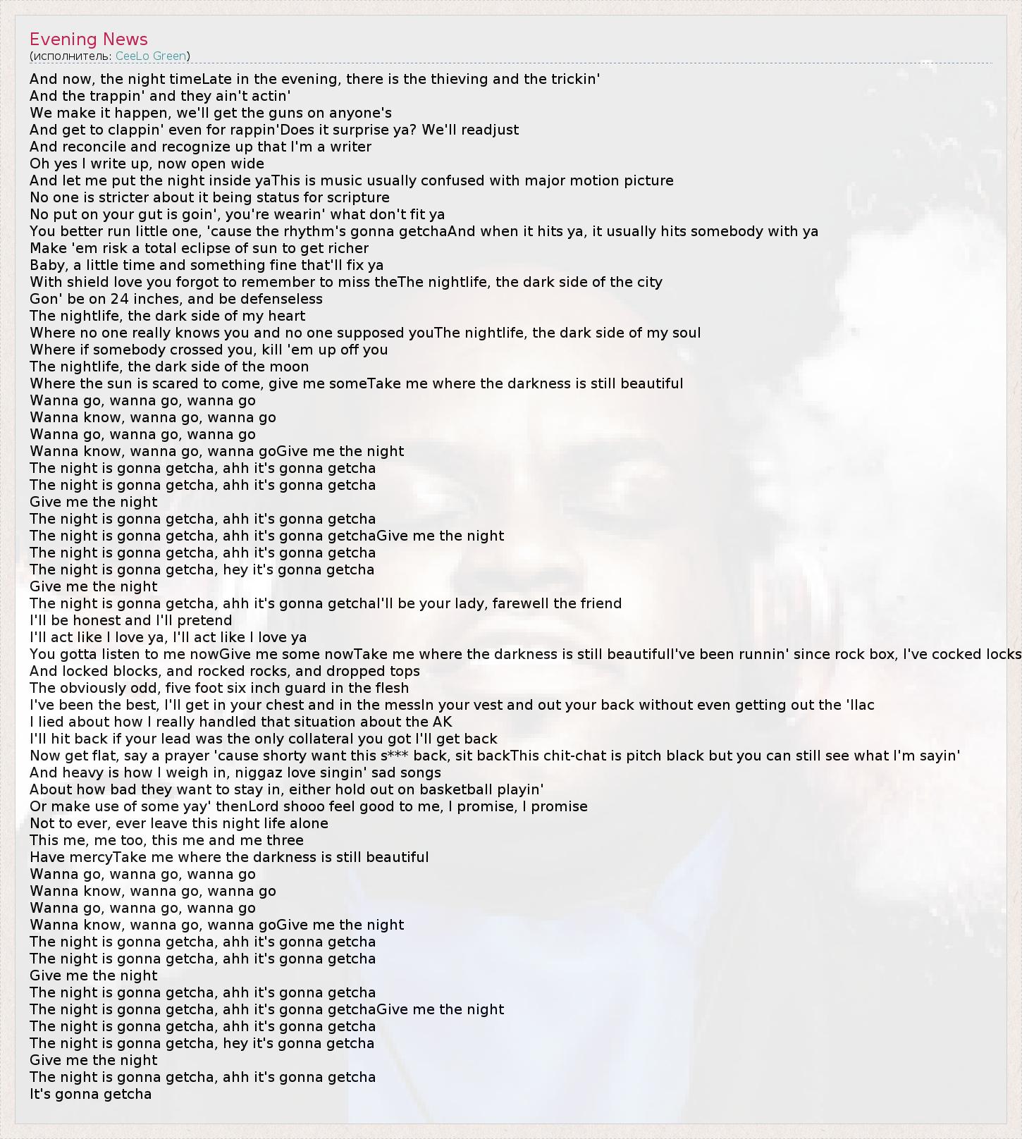 And now, the night timeLate in the evening, there is the thieving and the trickin' And the trappin' and they ain't actin' We make it happen, we'll get the guns on anyone's And get to clappin' even for rappin'Does it surprise ya? We'll readjust And reconcile and recognize up that I'm a writer Oh yes I write up, now open wide And let me put the night inside yaThis is music usually confused with major motion picture No one is stricter about it being status for scripture No put on your gut is goin', you're wearin' what don't fit ya You better run little one, 'cause the rhythm's gonna getchaAnd when it hits ya, it usually hits somebody with ya Make 'em risk a total eclipse of sun to get richer Baby, a little time and something fine that'll fix ya With shield love you forgot to remember to miss theThe nightlife, the dark side of the city Gon' be on 24 inches, and be defenseless The nightlife, the dark side of my heart Where no one really knows you and no one supposed youThe nightlife, the dark side of my soul Where if somebody crossed you, kill 'em up off you The nightlife, the dark side of the moon Where the sun is scared to come, give me someTake me where the darkness is still beautiful Wanna go, wanna go, wanna go Wanna know, wanna go, wanna go Wanna go, wanna go, wanna go Wanna know, wanna go, wanna goGive me the night The night is gonna getcha, ahh it's gonna getcha The night is gonna getcha, ahh it's gonna getcha Give me the night The night is gonna getcha, ahh it's gonna getcha The night is gonna getcha, ahh it's gonna getchaGive me the night The night is gonna getcha, ahh it's gonna getcha The night is gonna getcha, hey it's gonna getcha Give me the night The night is gonna getcha, ahh it's gonna getchaI'll be your lady, farewell the friend I'll be honest and I'll pretend I'll act like I love ya, I'll act like I love ya You gotta listen to me nowGive me some nowTake me where the darkness is still beautifulI've been runnin' since rock box, I've cocked locks And locked blocks, and rocked rocks, and dropped tops The obviously odd, five foot six inch guard in the flesh I've been the best, I'll get in your chest and in the messIn your vest and out your back without even getting out the 'llac I lied about how I really handled that situation about the AK I'll hit back if your lead was the only collateral you got I'll get back Now get flat, say a prayer 'cause shorty want this s*** back, sit backThis chit-chat is pitch black but you can still see what I'm sayin' And heavy is how I weigh in, niggaz love singin' sad songs About how bad they want to stay in, either hold out on basketball playin' Or make use of some yay' thenLord shooo feel good to me, I promise, I promise Not to ever, ever leave this night life alone This me, me too, this me and me three Have mercyTake me where the darkness is still beautiful Wanna go, wanna go, wanna go Wanna know, wanna go, wanna go Wanna go, wanna go, wanna go Wanna know, wanna go, wanna goGive me the night The night is gonna getcha, ahh it's gonna getcha The night is gonna getcha, ahh it's gonna getcha Give me the night The night is gonna getcha, ahh it's gonna getcha The night is gonna getcha, ahh it's gonna getchaGive me the night The night is gonna getcha, ahh it's gonna getcha The night is gonna getcha, hey it's gonna getcha Give me the night The night is gonna getcha, ahh it's gonna getcha It's gonna getcha