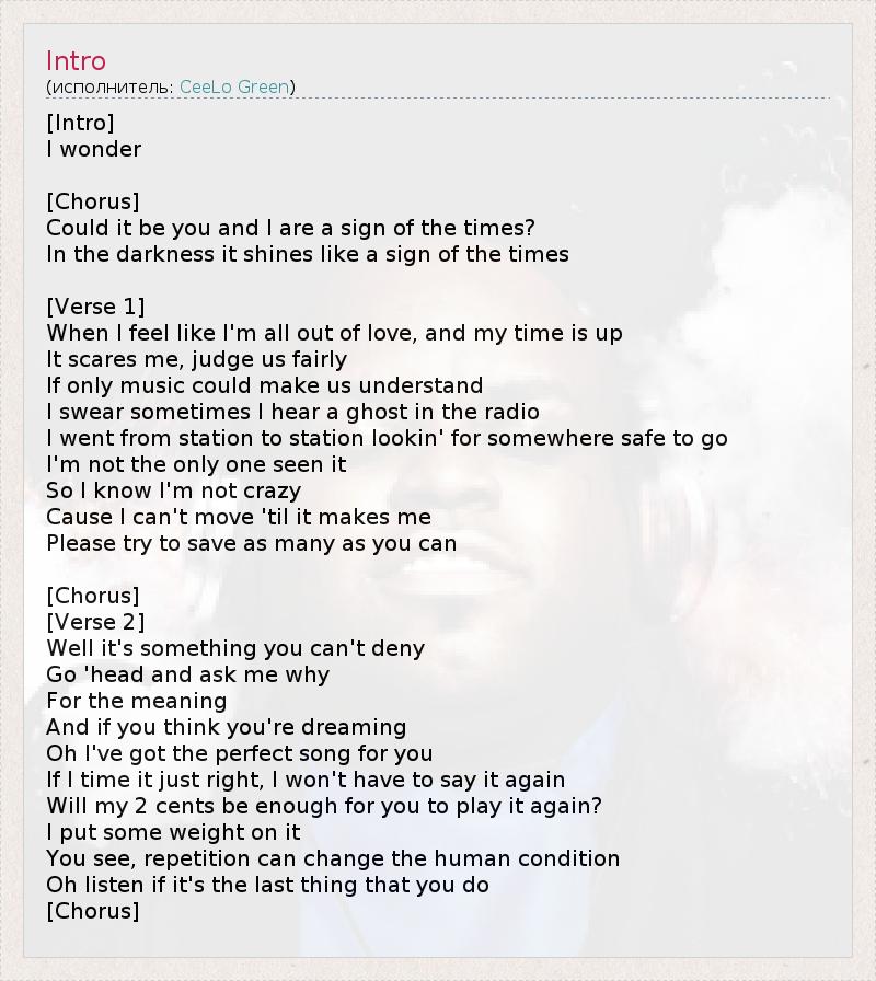[Intro] I wonder [Chorus] Could it be you and I are a sign of the times? In the darkness it shines like a sign of the times [Verse 1] When I feel like I'm all out of love, and my time is up It scares me, judge us fairly If only music could make us understand I swear sometimes I hear a ghost in the radio I went from station to station lookin' for somewhere safe to go I'm not the only one seen it So I know I'm not crazy Cause I can't move 'til it makes me Please try to save as many as you can [Chorus] [Verse 2] Well it's something you can't deny Go 'head and ask me why For the meaning And if you think you're dreaming Oh I've got the perfect song for you If I time it just right, I won't have to say it again Will my 2 cents be enough for you to play it again? I put some weight on it You see, repetition can change the human condition Oh listen if it's the last thing that you do [Chorus]