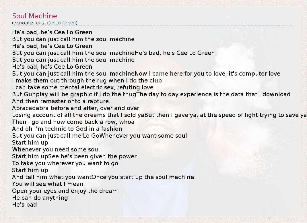 He's bad, he's Cee Lo Green But you can just call him the soul machine He's bad, he's Cee Lo Green But you can just call him the soul machineHe's bad, he's Cee Lo Green But you can just call him the soul machine He's bad, he's Cee Lo Green But you can just call him the soul machineNow I came here for you to love, it's computer love I make them cut through the rug when I do the club I can take some mental electric sex, refuting love But Gunplay will be graphic if I do the thugThe day to day experience is the data that I download And then remaster onto a rapture Abracadabra before and after, over and over Losing account of all the dreams that I sold yaBut then I gave ya, at the speed of light trying to save ya Then I go and now come back a row, whoa And oh I'm technic to God in a fashion But you can just call me Lo GoWhenever you want some soul Start him up Whenever you need some soul Start him upSee he's been given the power To take you wherever you want to go Start him up And tell him what you wantOnce you start up the soul machine You will see what I mean Open your eyes and enjoy the dream He can do anything He's bad