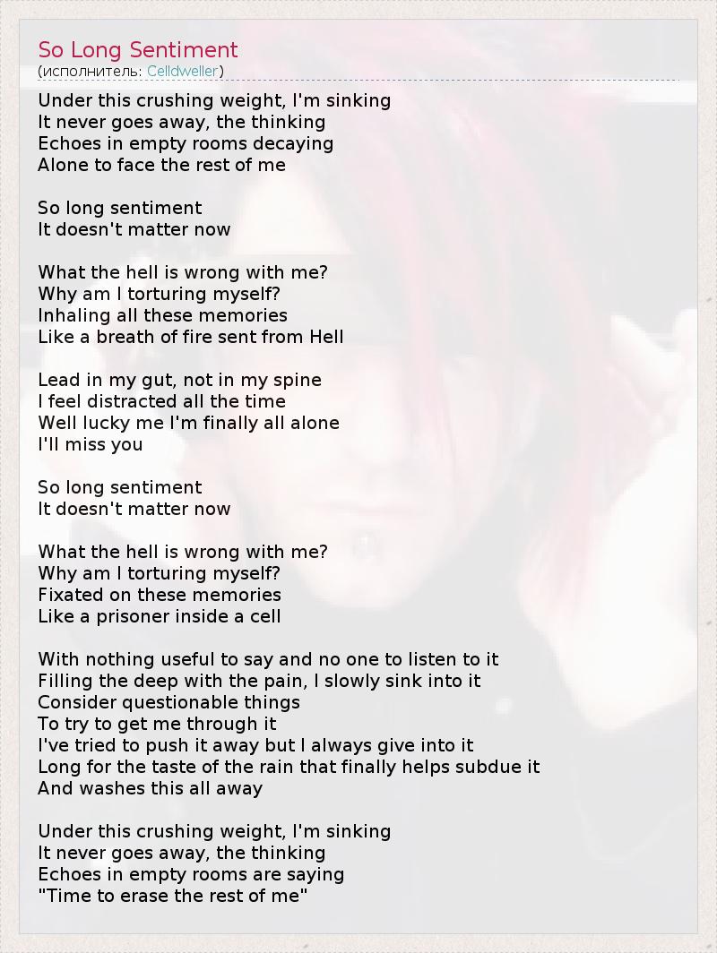 Under this crushing weight, I'm sinking It never goes away, the thinking Echoes in empty rooms decaying Alone to face the rest of me So long sentiment It doesn't matter now What the hell is wrong with me? Why am I torturing myself? Inhaling all these memories Like a breath of fire sent from Hell Lead in my gut, not in my spine I feel distracted all the time Well lucky me I'm finally all alone I'll miss you So long sentiment It doesn't matter now What the hell is wrong with me? Why am I torturing myself? Fixated on these memories Like a prisoner inside a cell With nothing useful to say and no one to listen to it Filling the deep with the pain, I slowly sink into it Consider questionable things To try to get me through it I've tried to push it away but I always give into it Long for the taste of the rain that finally helps subdue it And washes this all away Under this crushing weight, I'm sinking It never goes away, the thinking Echoes in empty rooms are saying "Time to erase the rest of me"