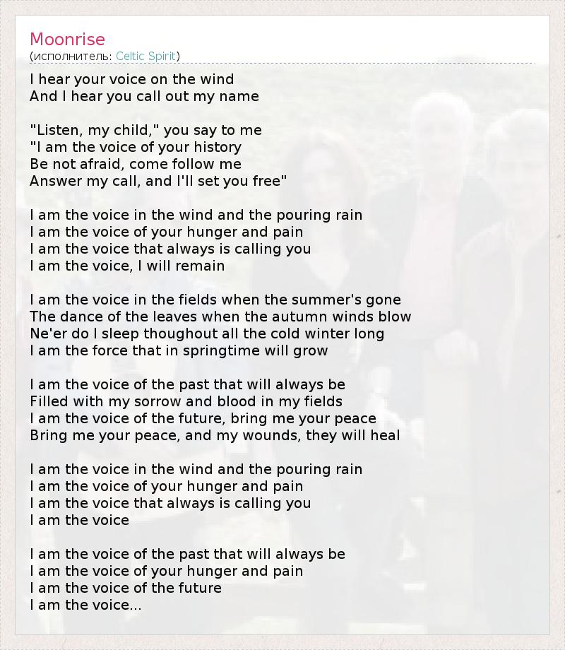 I hear your voice on the wind And I hear you call out my name "Listen, my child," you say to me "I am the voice of your history Be not afraid, come follow me Answer my call, and I'll set you free" I am the voice in the wind and the pouring rain I am the voice of your hunger and pain I am the voice that always is calling you I am the voice, I will remain I am the voice in the fields when the summer's gone The dance of the leaves when the autumn winds blow Ne'er do I sleep thoughout all the cold winter long I am the force that in springtime will grow I am the voice of the past that will always be Filled with my sorrow and blood in my fields I am the voice of the future, bring me your peace Bring me your peace, and my wounds, they will heal I am the voice in the wind and the pouring rain I am the voice of your hunger and pain I am the voice that always is calling you I am the voice I am the voice of the past that will always be I am the voice of your hunger and pain I am the voice of the future I am the voice...