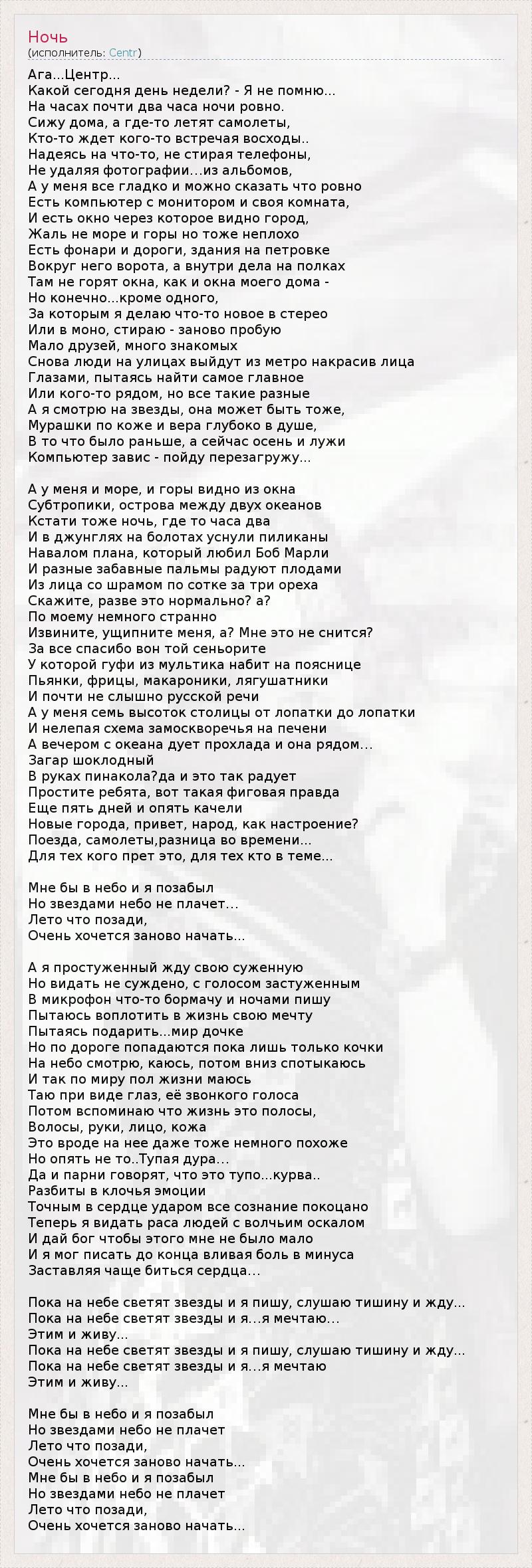 Ага...Центр... Какой сегодня день недели? - Я не помню... На часах почти два часа ночи ровно. Сижу дома, а где-то летят самолеты, Кто-то ждет кого-то встречая восходы.. Надеясь на что-то, не стирая телефоны, Не удаляя фотографии…из альбомов, А у меня все гладко и можно сказать что ровно Есть компьютер с монитором и своя комната, И есть окно через которое видно город, Жаль не море и горы но тоже неплохо Есть фонари и дороги, здания на петровке Вокруг него ворота, а внутри дела на полках Там не горят окна, как и окна моего дома - Но конечно...кроме одного, За которым я делаю что-то новое в стерео Или в моно, стираю - заново пробую Мало друзей, много знакомых Снова люди на улицах выйдут из метро накрасив лица Глазами, пытаясь найти самое главное Или кого-то рядом, но все такие разные А я смотрю на звезды, она может быть тоже, Мурашки по коже и вера глубоко в душе, В то что было раньше, а сейчас осень и лужи Компьютер завис - пойду перезагружу... А у меня и море, и горы видно из окна Субтропики, острова между двух океанов Кстати тоже ночь, где то часа два И в джунглях на болотах уснули пиликаны Навалом плана, который любил Боб Марли И разные забавные пальмы радуют плодами Из лица со шрамом по сотке за три ореха Скажите, разве это нормально? а? По моему немного странно Извините, ущипните меня, а? Мне это не снится? За все спасибо вон той сеньорите У которой гуфи из мультика набит на пояснице Пьянки, фрицы, макароники, лягушатники И почти не слышно русской речи А у меня семь высоток столицы от лопатки до лопатки И нелепая схема замоскворечья на печени А вечером с океана дует прохлада и она рядом… Загар шоклодный В руках пинакола?да и это так радует Простите ребята, вот такая фиговая правда Еще пять дней и опять качели Новые города, привет, народ, как настроение? Поезда, самолеты,разница во времени... Для тех кого прет это, для тех кто в теме... Мне бы в небо и я позабыл Но звездами небо не плачет… Лето что позади, Очень хочется заново начать... А я простуженный жду свою суженную Но видать не суждено, с голосом застуженным В микрофон что-то бормачу и ночами пишу Пытаюсь воплотить в жизнь свою мечту Пытаясь подарить...мир дочке Но по дороге попадаются пока лишь только кочки На небо смотрю, каюсь, потом вниз спотыкаюсь И так по миру пол жизни маюсь Таю при виде глаз, её звонкого голоса Потом вспоминаю что жизнь это полосы, Волосы, руки, лицо, кожа Это вроде на нее даже тоже немного похоже Но опять не то..Тупая дура… Да и парни говорят, что это тупо...курва.. Разбиты в клочья эмоции Точным в сердце ударом все сознание покоцано Теперь я видать раса людей с волчьим оскалом И дай бог чтобы этого мне не было мало И я мог писать до конца вливая боль в минуса Заставляя чаще биться сердца… Пока на небе светят звезды и я пишу, слушаю тишину и жду... Пока на небе светят звезды и я…я мечтаю… Этим и живу... Пока на небе светят звезды и я пишу, слушаю тишину и жду... Пока на небе светят звезды и я…я мечтаю Этим и живу... Мне бы в небо и я позабыл Но звездами небо не плачет Лето что позади, Очень хочется заново начать... Мне бы в небо и я позабыл Но звездами небо не плачет Лето что позади, Очень хочется заново начать...