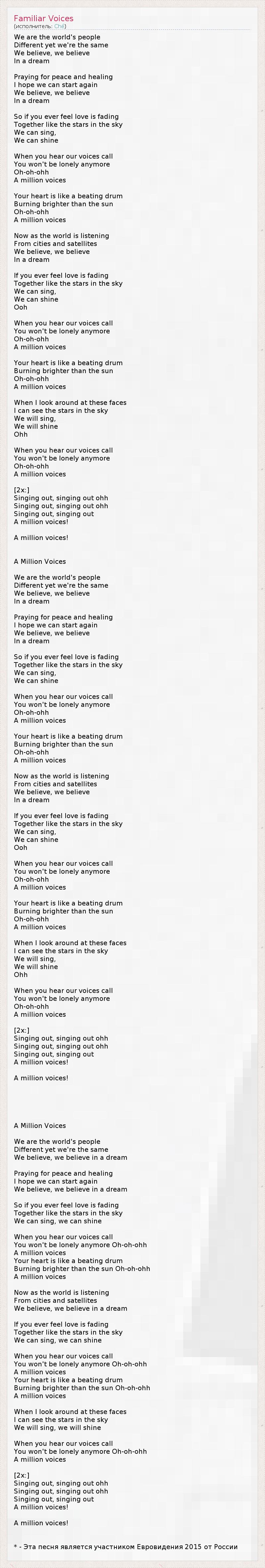 We are the world's people Different yet we're the same We believe, we believe In a dream Praying for peace and healing I hope we can start again We believe, we believe In a dream So if you ever feel love is fading Together like the stars in the sky We can sing, We can shine When you hear our voices call You won't be lonely anymore Oh-oh-ohh A million voices Your heart is like a beating drum Burning brighter than the sun Oh-oh-ohh A million voices Now as the world is listening From cities and satellites We believe, we believe In a dream If you ever feel love is fading Together like the stars in the sky We can sing, We can shine Ooh When you hear our voices call You won't be lonely anymore Oh-oh-ohh A million voices Your heart is like a beating drum Burning brighter than the sun Oh-oh-ohh A million voices When I look around at these faces I can see the stars in the sky We will sing, We will shine Ohh When you hear our voices call You won't be lonely anymore Oh-oh-ohh A million voices [2x:] Singing out, singing out ohh Singing out, singing out ohh Singing out, singing out A million voices! A million voices! A Million Voices We are the world's people Different yet we're the same We believe, we believe In a dream Praying for peace and healing I hope we can start again We believe, we believe In a dream So if you ever feel love is fading Together like the stars in the sky We can sing, We can shine When you hear our voices call You won't be lonely anymore Oh-oh-ohh A million voices Your heart is like a beating drum Burning brighter than the sun Oh-oh-ohh A million voices Now as the world is listening From cities and satellites We believe, we believe In a dream If you ever feel love is fading Together like the stars in the sky We can sing, We can shine Ooh When you hear our voices call You won't be lonely anymore Oh-oh-ohh A million voices Your heart is like a beating drum Burning brighter than the sun Oh-oh-ohh A million voices When I look around at these faces I can see the stars in the sky We will sing, We will shine Ohh When you hear our voices call You won't be lonely anymore Oh-oh-ohh A million voices [2x:] Singing out, singing out ohh Singing out, singing out ohh Singing out, singing out A million voices! A million voices! A Million Voices We are the world's people Different yet we're the same We believe, we believe in a dream Praying for peace and healing I hope we can start again We believe, we believe in a dream So if you ever feel love is fading Together like the stars in the sky We can sing, we can shine When you hear our voices call You won't be lonely anymore Oh-oh-ohh A million voices Your heart is like a beating drum Burning brighter than the sun Oh-oh-ohh A million voices Now as the world is listening From cities and satellites We believe, we believe in a dream If you ever feel love is fading Together like the stars in the sky We can sing, we can shine When you hear our voices call You won't be lonely anymore Oh-oh-ohh A million voices Your heart is like a beating drum Burning brighter than the sun Oh-oh-ohh A million voices When I look around at these faces I can see the stars in the sky We will sing, we will shine When you hear our voices call You won't be lonely anymore Oh-oh-ohh A million voices [2x:] Singing out, singing out ohh Singing out, singing out ohh Singing out, singing out A million voices! A million voices! * - Эта песня является участником Евровидения 2015 от России