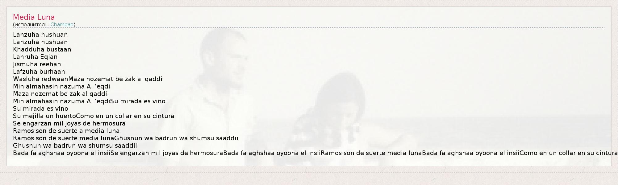 Lahzuha nushuan Lahzuha nushuan Khadduha bustaan Lahruha Eqian Jismuha reehan Lafzuha burhaan Wasluha redwaanMaza nozemat be zak al qaddi Min almahasin nazuma Al 'eqdi Maza nozemat be zak al qaddi Min almahasin nazuma Al 'eqdiSu mirada es vino Su mirada es vino Su mejilla un huertoComo en un collar en su cintura Se engarzan mil joyas de hermosura Ramos son de suerte a media luna Ramos son de suerte media lunaGhusnun wa badrun wa shumsu saaddii Ghusnun wa badrun wa shumsu saaddii Bada fa aghshaa oyoona el insiiSe engarzan mil joyas de hermosuraBada fa aghshaa oyoona el insiiRamos son de suerte media lunaBada fa aghshaa oyoona el insiiComo en un collar en su cintura