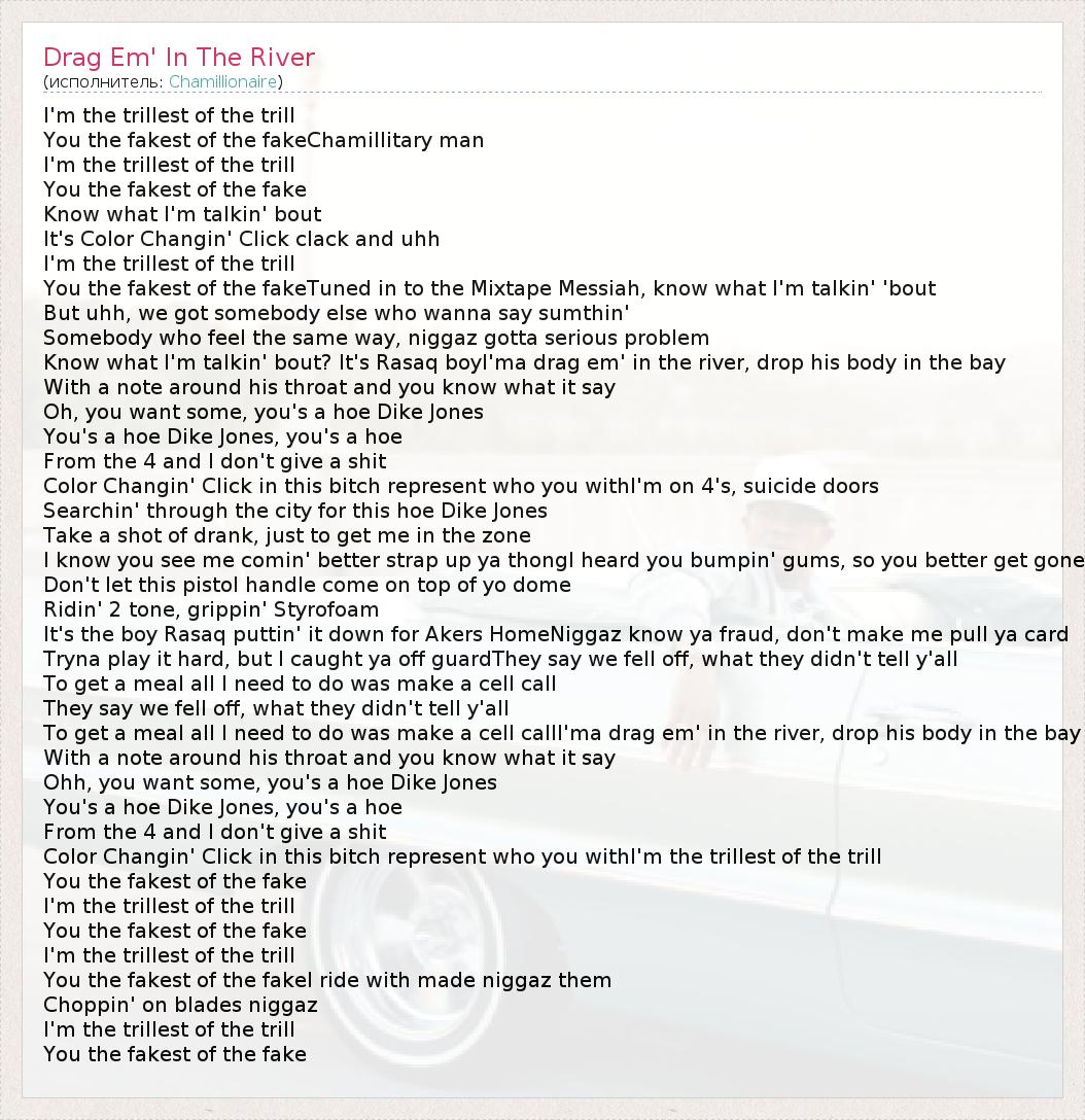 А как ты думаешь, о чем песня "Drag Em' In The River" ?