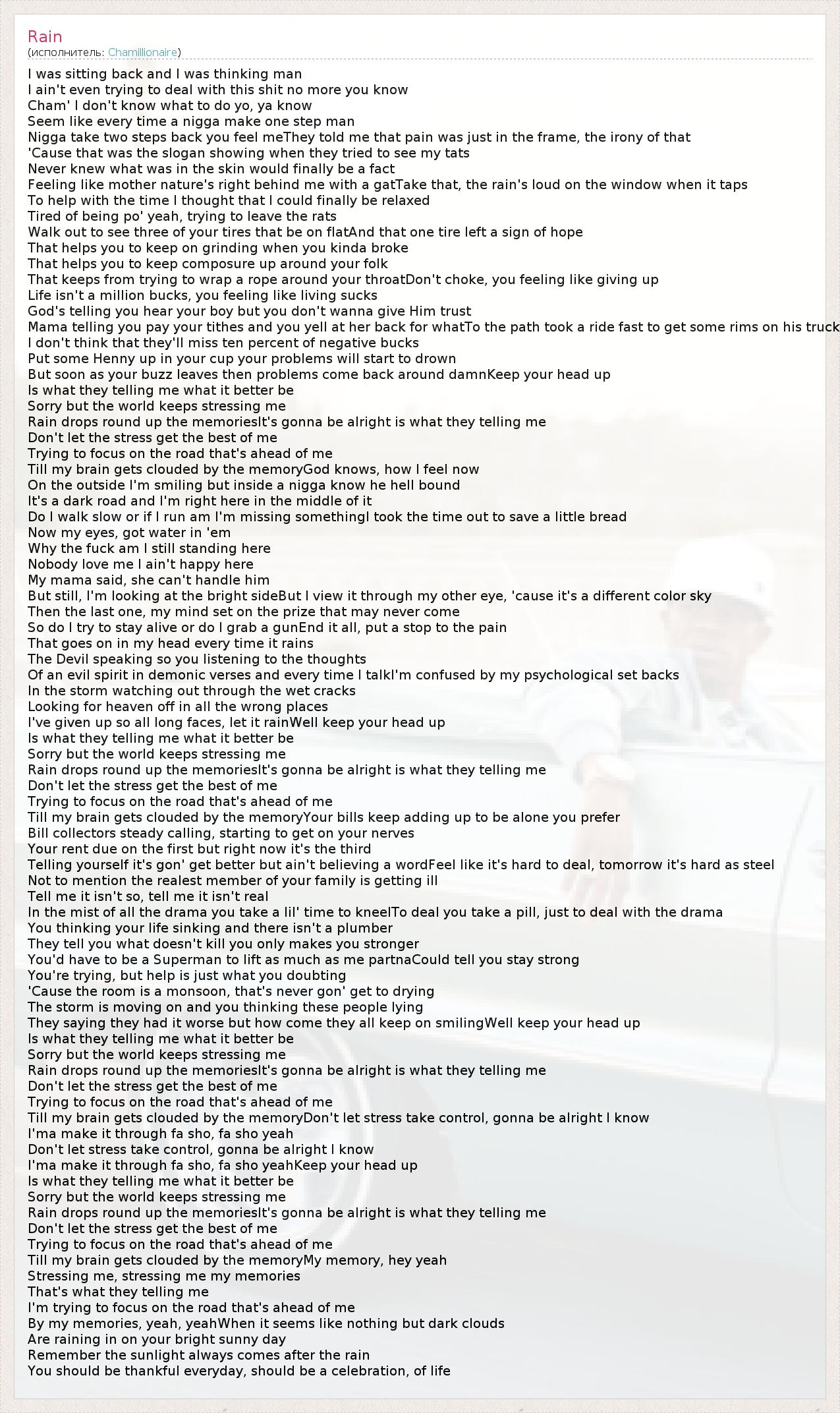 Rain drops round up the memoriesIt's gonna be alright is what they telling me