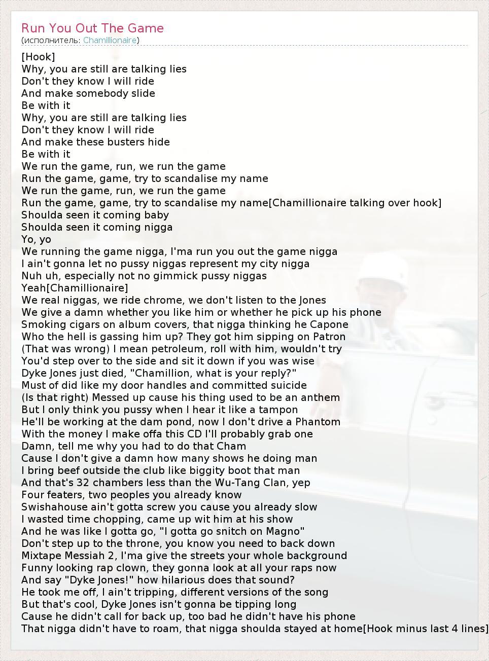 А как ты думаешь, о чем песня "Run You Out The Game" ?