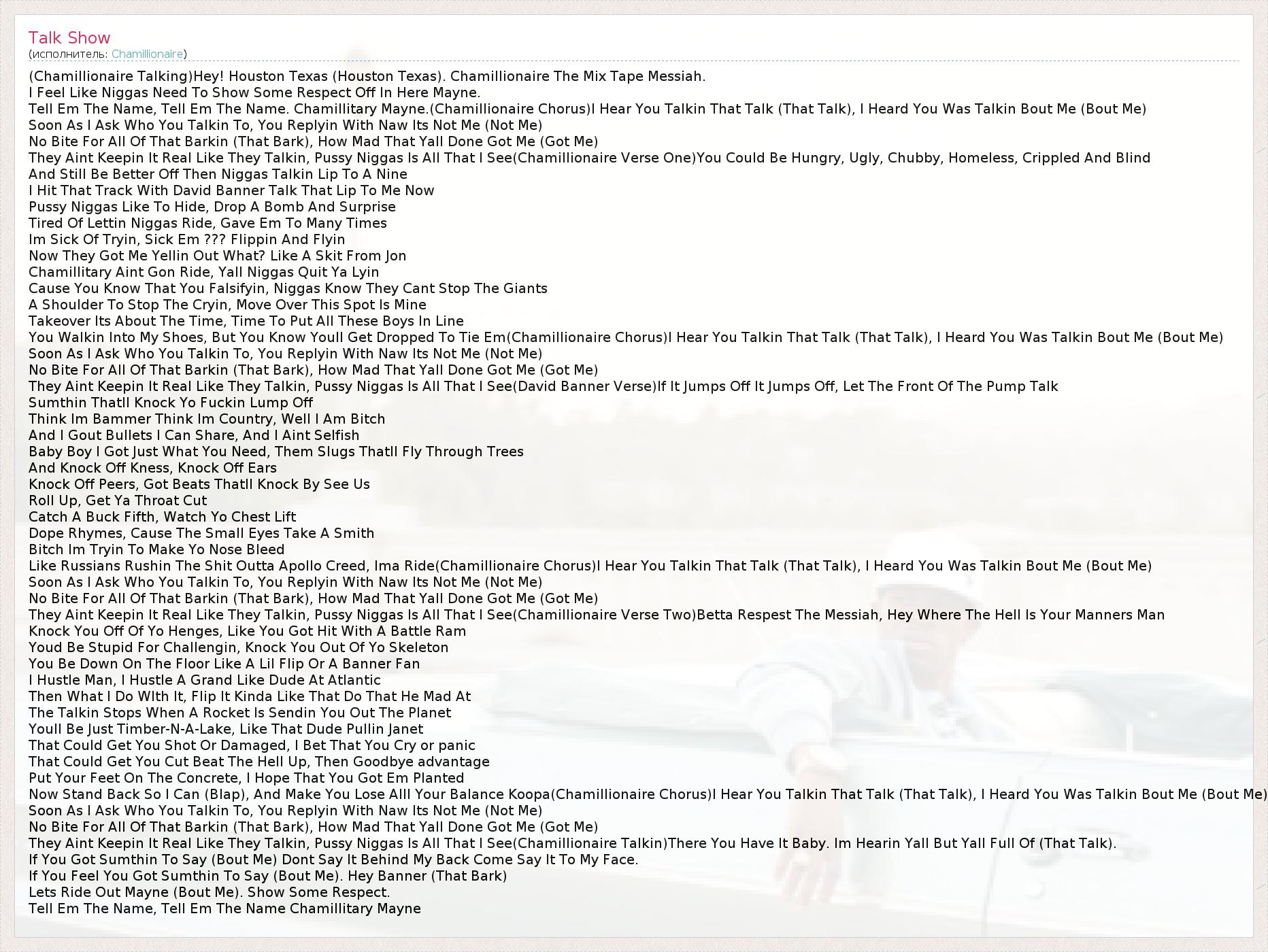 They Aint Keepin It Real Like They Talkin, Pussy Niggas Is All That I See(Chamillionaire Verse Two)Betta Respest The Messiah, Hey Where The Hell Is Your Manners Man