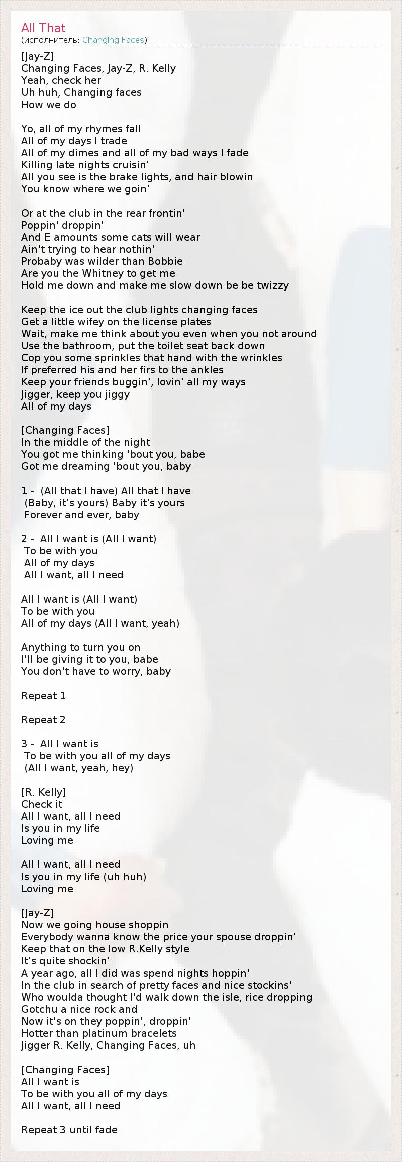 [Jay-Z] Changing Faces, Jay-Z, R. Kelly Yeah, check her Uh huh, Changing faces How we do Yo, all of my rhymes fall All of my days I trade All of my dimes and all of my bad ways I fade Killing late nights cruisin' All you see is the brake lights, and hair blowin You know where we goin' Or at the club in the rear frontin' Poppin' droppin' And E amounts some cats will wear Ain't trying to hear nothin' Probaby was wilder than Bobbie Are you the Whitney to get me Hold me down and make me slow down be be twizzy Keep the ice out the club lights changing faces Get a little wifey on the license plates Wait, make me think about you even when you not around Use the bathroom, put the toilet seat back down Cop you some sprinkles that hand with the wrinkles If preferred his and her firs to the ankles Keep your friends buggin', lovin' all my ways Jigger, keep you jiggy All of my days [Changing Faces] In the middle of the night You got me thinking 'bout you, babe Got me dreaming 'bout you, baby 1 - (All that I have) All that I have (Baby, it's yours) Baby it's yours Forever and ever, baby 2 - All I want is (All I want) To be with you All of my days All I want, all I need All I want is (All I want) To be with you All of my days (All I want, yeah) Anything to turn you on I'll be giving it to you, babe You don't have to worry, baby Repeat 1 Repeat 2 3 - All I want is To be with you all of my days (All I want, yeah, hey) [R. Kelly] Check it All I want, all I need Is you in my life Loving me All I want, all I need Is you in my life (uh huh) Loving me [Jay-Z] Now we going house shoppin Everybody wanna know the price your spouse droppin' Keep that on the low R.Kelly style It's quite shockin' A year ago, all I did was spend nights hoppin' In the club in search of pretty faces and nice stockins' Who woulda thought I'd walk down the isle, rice dropping Gotchu a nice rock and Now it's on they poppin', droppin' Hotter than platinum bracelets Jigger R. Kelly, Changing Faces, uh [Changing Faces] All I want is To be with you all of my days All I want, all I need Repeat 3 until fade
