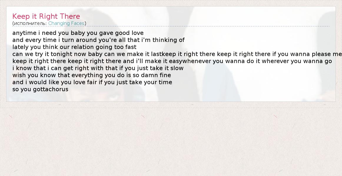 anytime i need you baby you gave good love and every time i turn around you're all that i'm thinking of lately you think our relation going too fast can we try it tonight now baby can we make it lastkeep it right there keep it right there if you wanna please me keep it right there keep it right there and i'll make it easywhenever you wanna do it wherever you wanna go i know that i can get right with that if you just take it slow wish you know that everything you do is so damn fine and i would like you love fair if you just take your time so you gottachorus