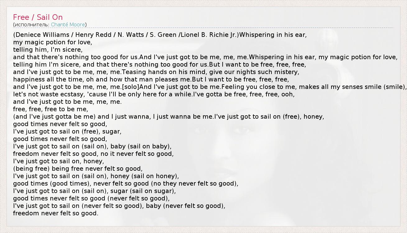 (Deniece Williams / Henry Redd / N. Watts / S. Green /Lionel B. Richie Jr.)Whispering in his ear, my magic potion for love, telling him, I'm sicere, and that there's nothing too good for us.And I've just got to be me, me, me.Whispering in his ear, my magic potion for love, telling him I'm sicere, and that there's nothing too good for us.But I want to be free, free, free, and I've just got to be me, me, me.Teasing hands on his mind, give our nights such mistery, happiness all the time, oh and how that man pleases me.But I want to be free, free, free, and I've just got to be me, me, me.[solo]And I've just got to be me.Feeling you close to me, makes all my senses smile (smile), let's not waste ecstasy, 'cause I'll be only here for a while.I've gotta be free, free, free, ooh, and I've just got to be me, me, me. free, free, free to be me, (and I've just gotta be me) and I just wanna, I just wanna be me.I've just got to sail on (free), honey, good times never felt so good, I've just got to sail on (free), sugar, good times never felt so good, I've just got to sail on (sail on), baby (sail on baby), freedom never felt so good, no it never felt so good, I've just got to sail on, honey, (being free) being free never felt so good, I've just got to sail on (sail on), honey (sail on honey), good times (good times), never felt so good (no they never felt so good), I've just got to sail on (sail on), sugar (sail on sugar), good times never felt so good (never felt so good), I've just got to sail on (never felt so good), baby (never felt so good), freedom never felt so good.